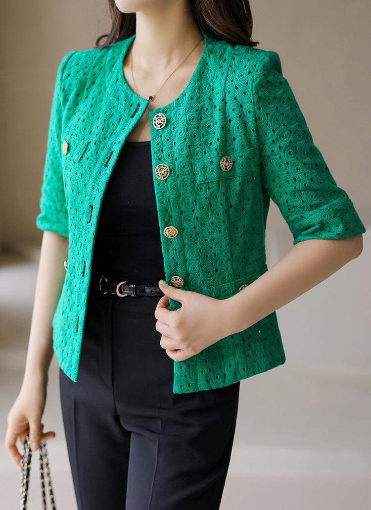 【4色展開】ローズモチーフ刺繍ノーカラー半袖パンチングジャケット jk41298