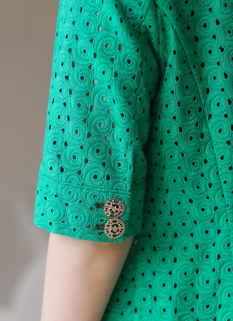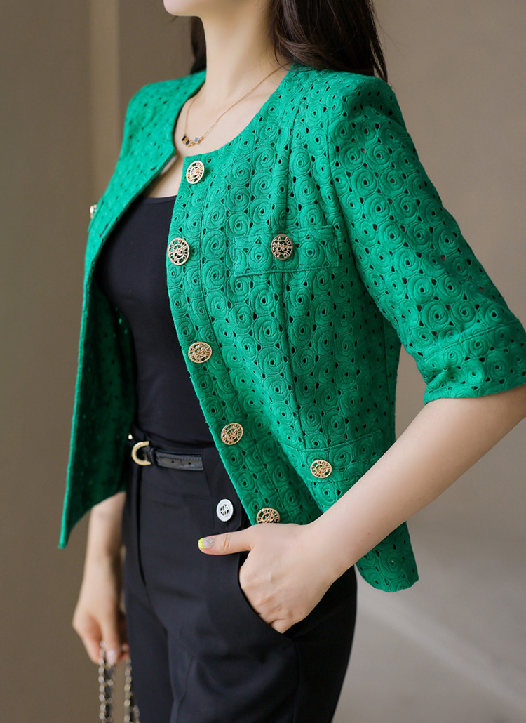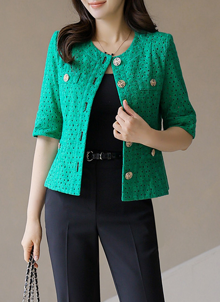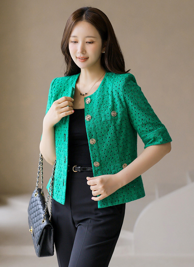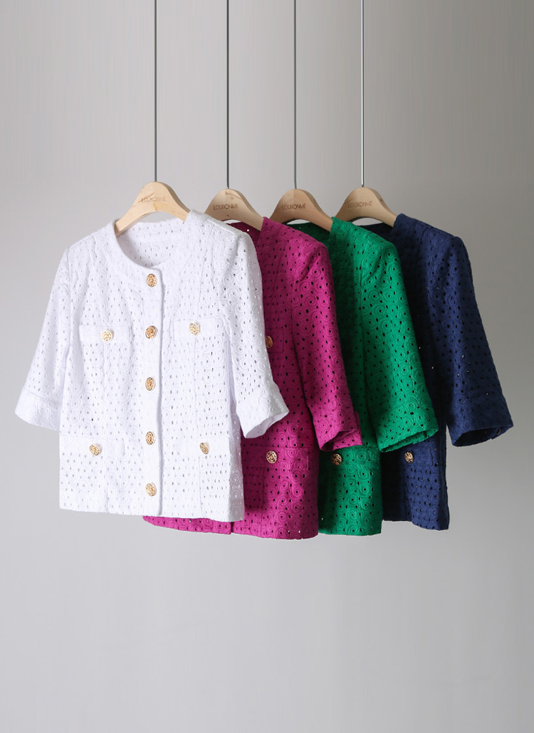 【4色展開】ローズモチーフ刺繍ノーカラー半袖パンチングジャケット jk41298