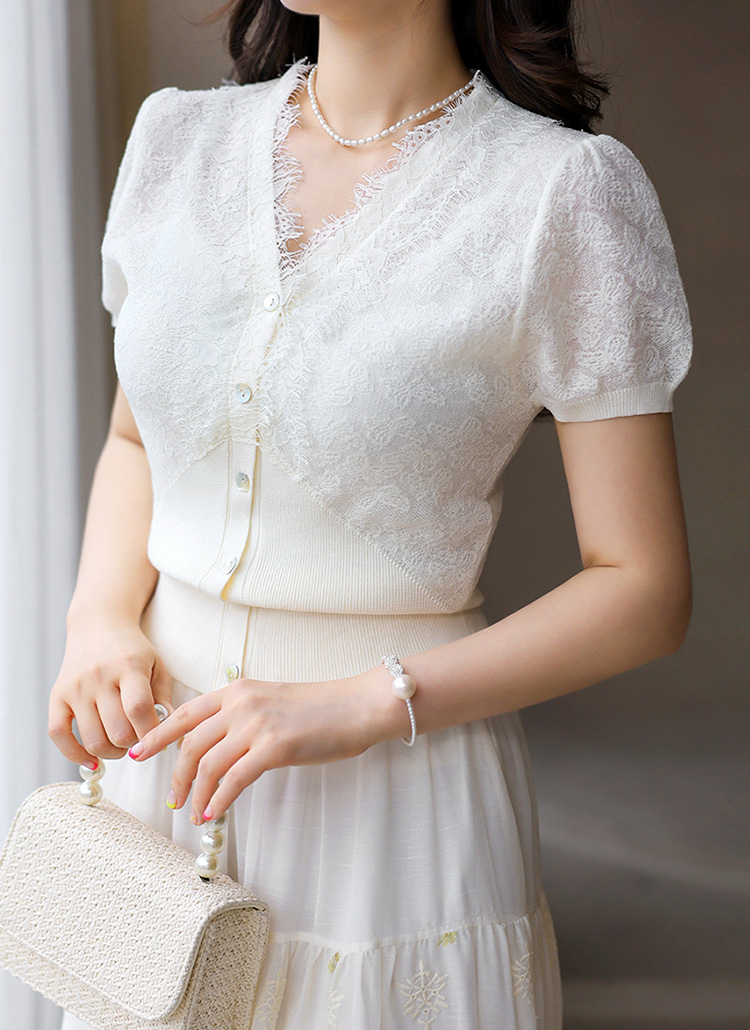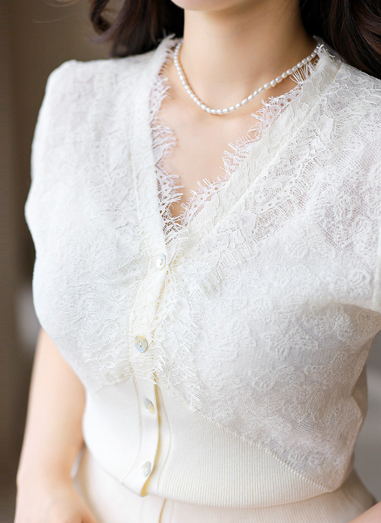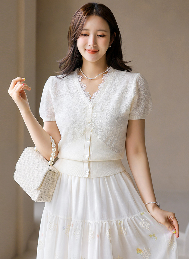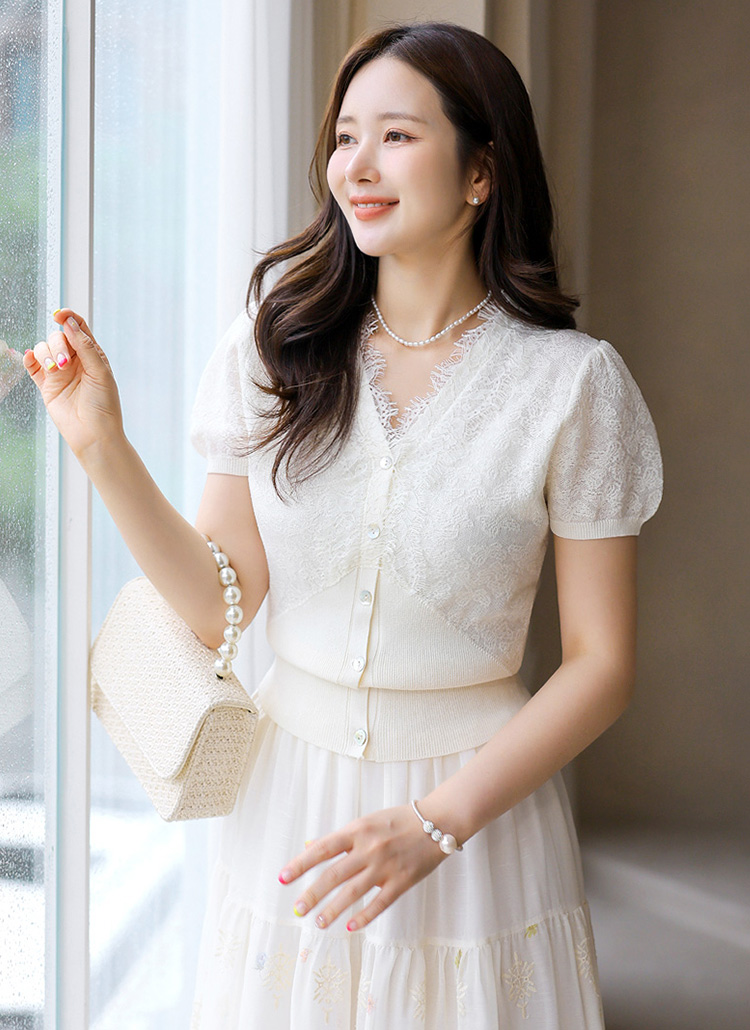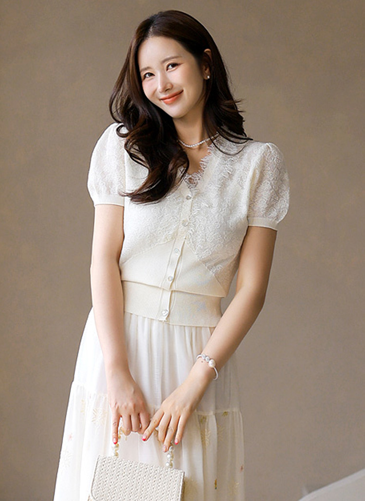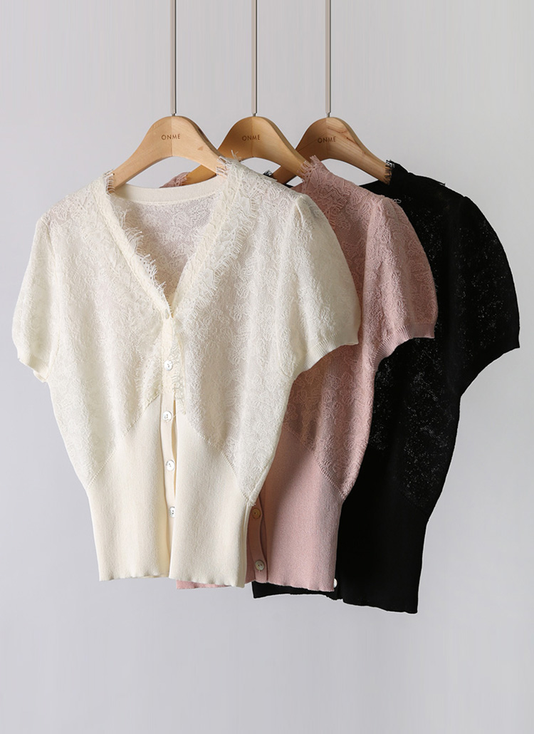 レースドッキングVネック半袖ジャガードニットカーディガン cd41355