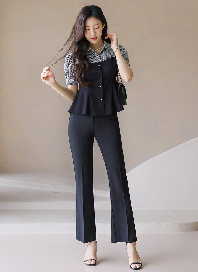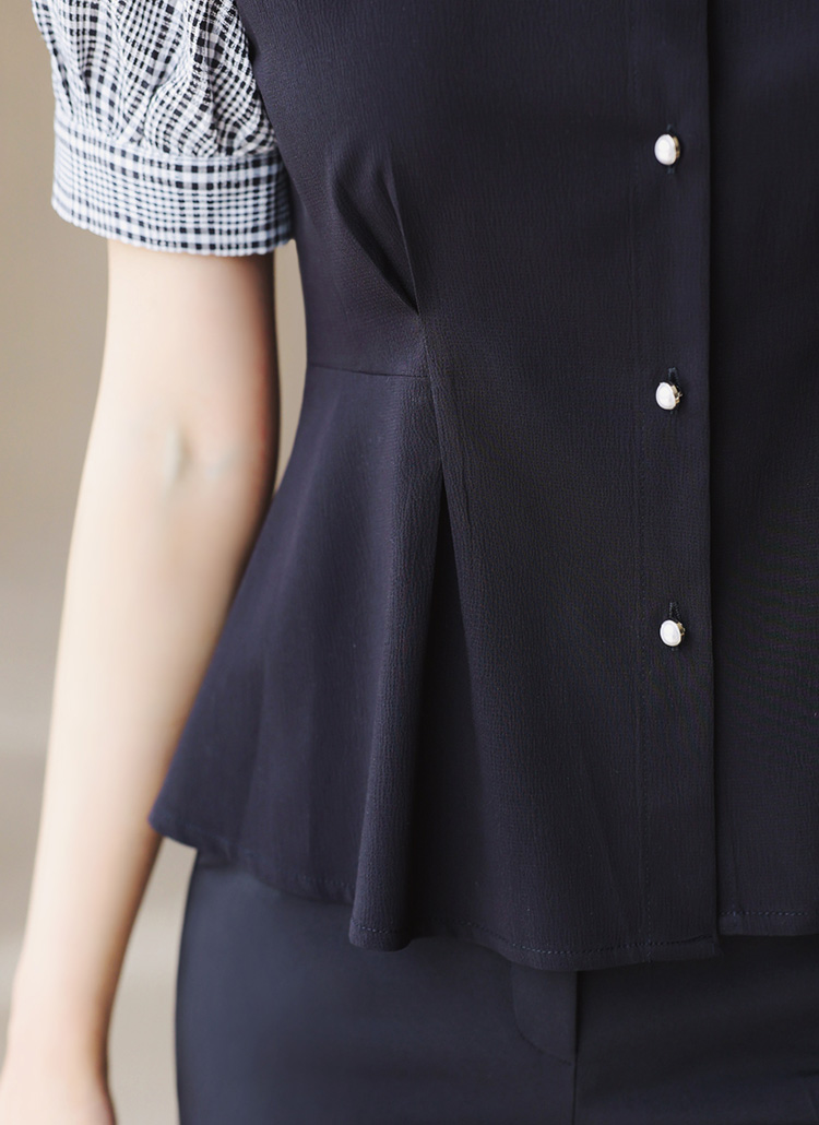 체크 배색과 페플럼 라인으로 여성스러움을 강조한
