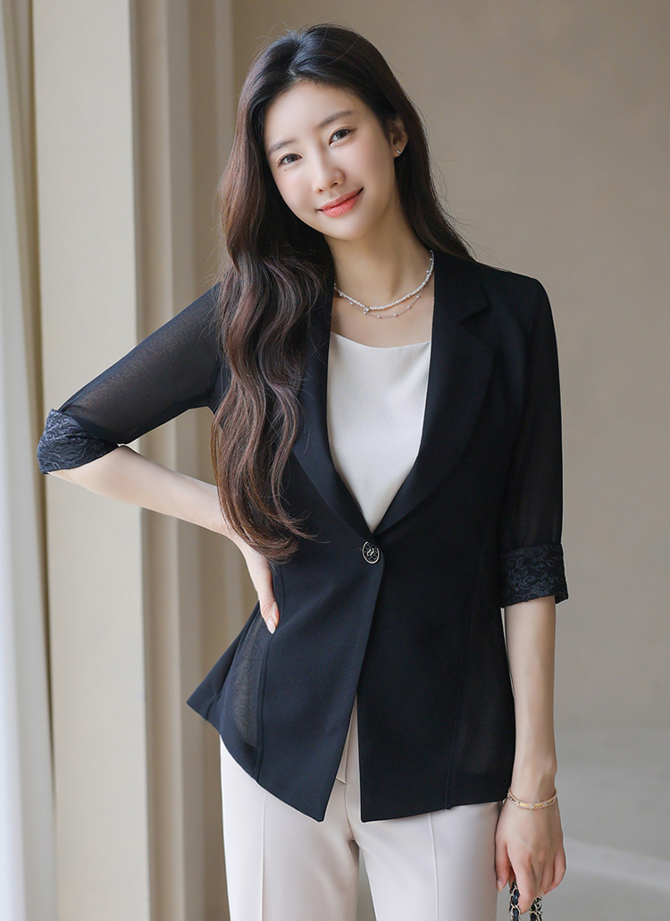 레이스 롤업 소매가 돋보이는 시스루 슬림 자켓으로
