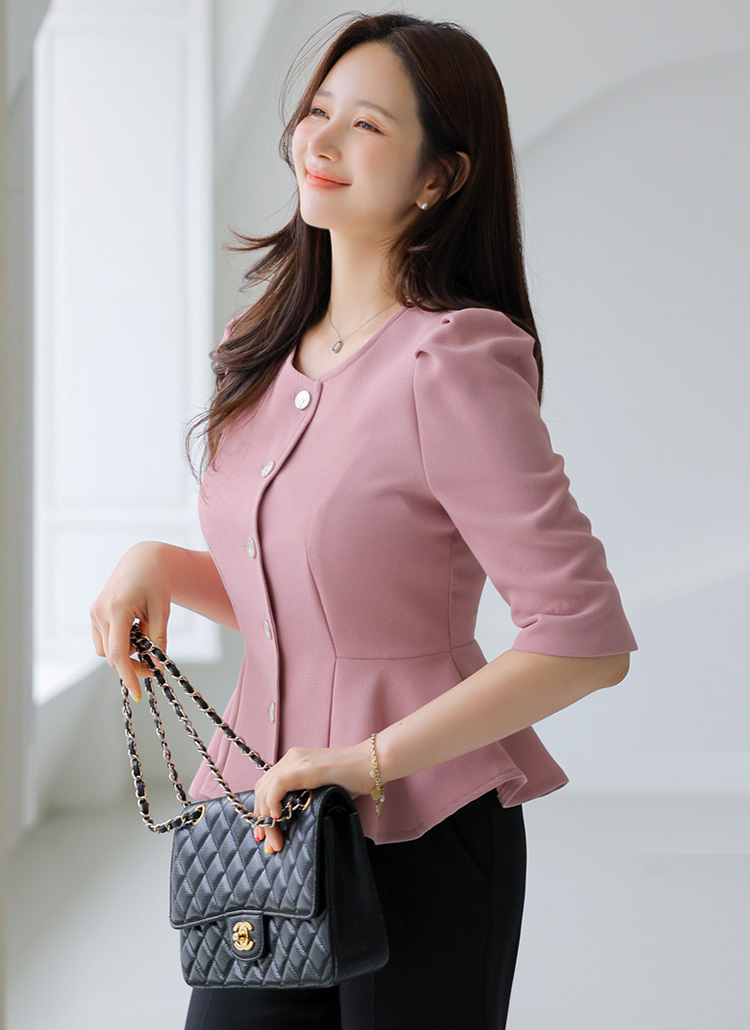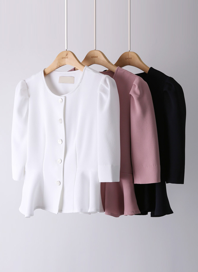 잘록한 허리라인과 밑단 셔링 페플럼으로 사랑스러운 실루엣을 완성하는 블라우스에요 :)