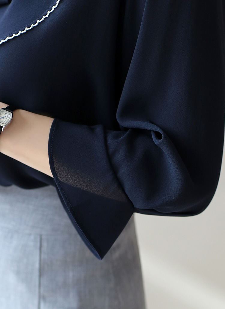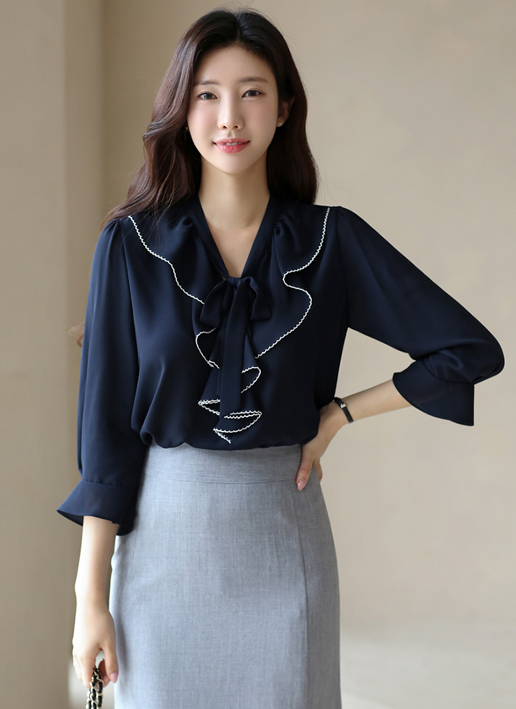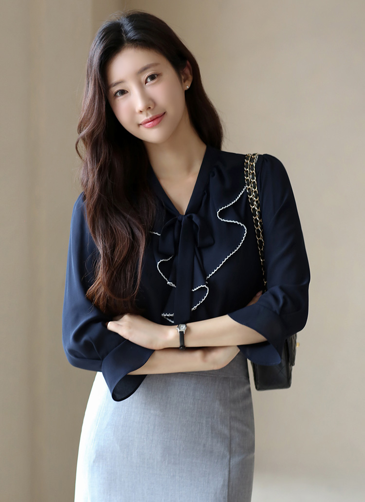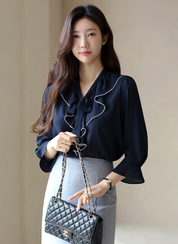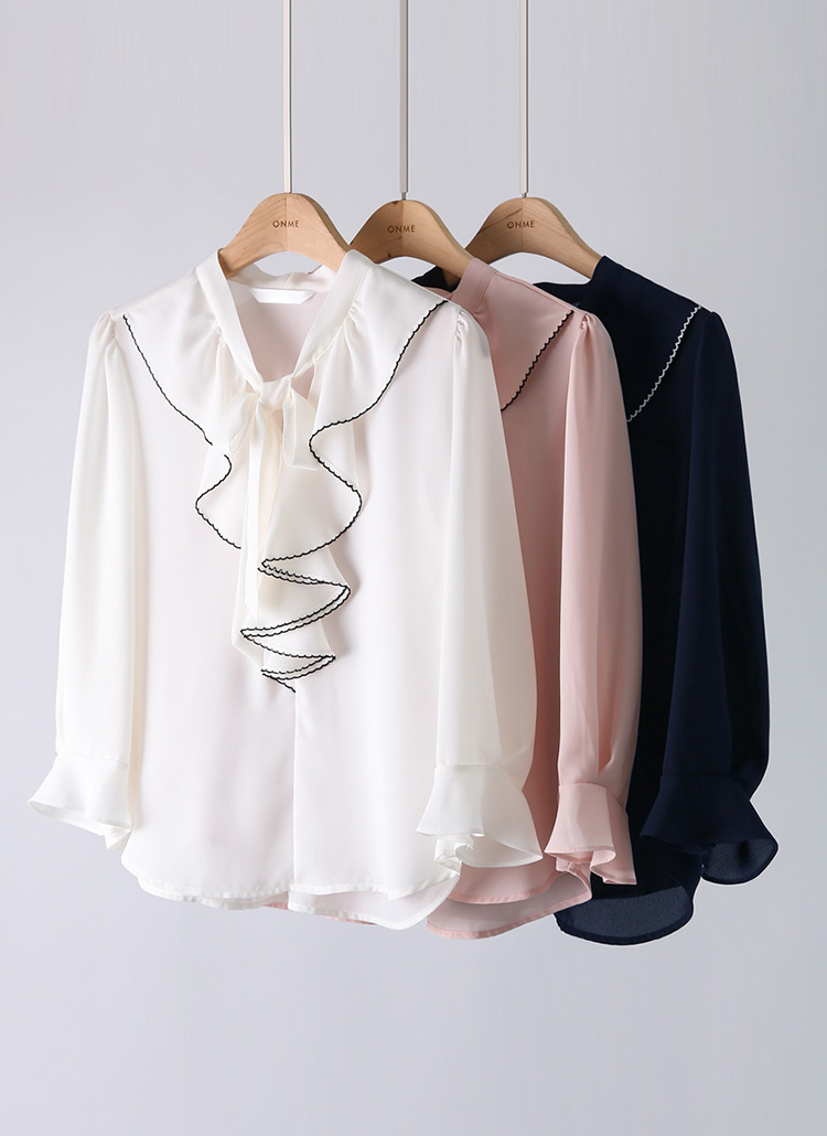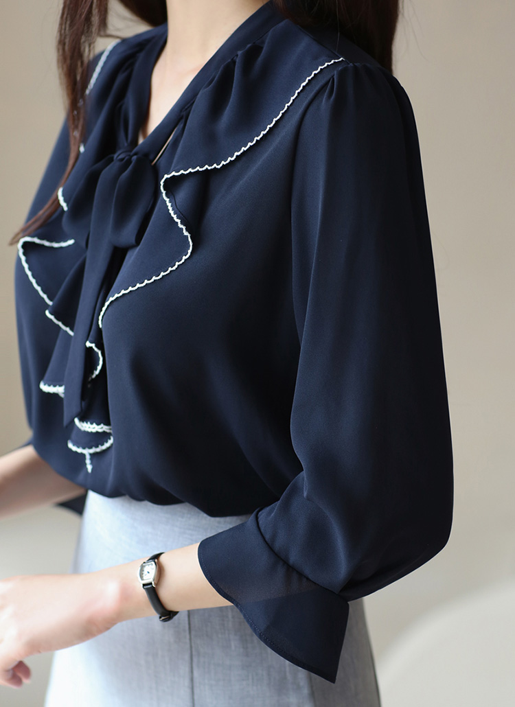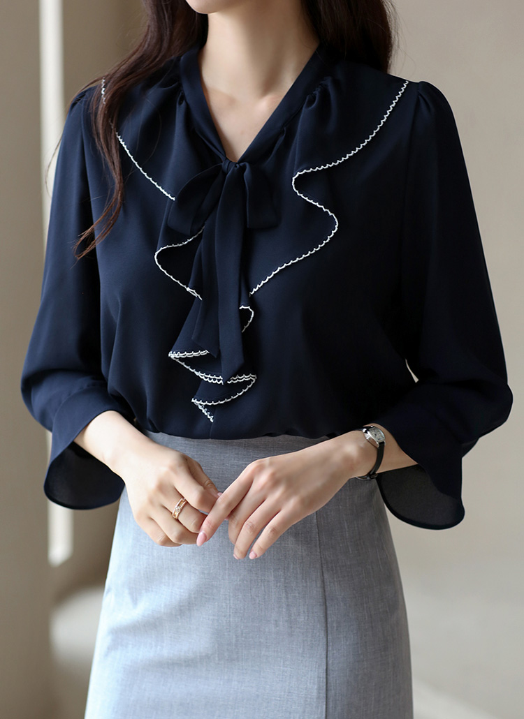 配色ステッチフリルリボンタイ7分袖ブラウス bl41549