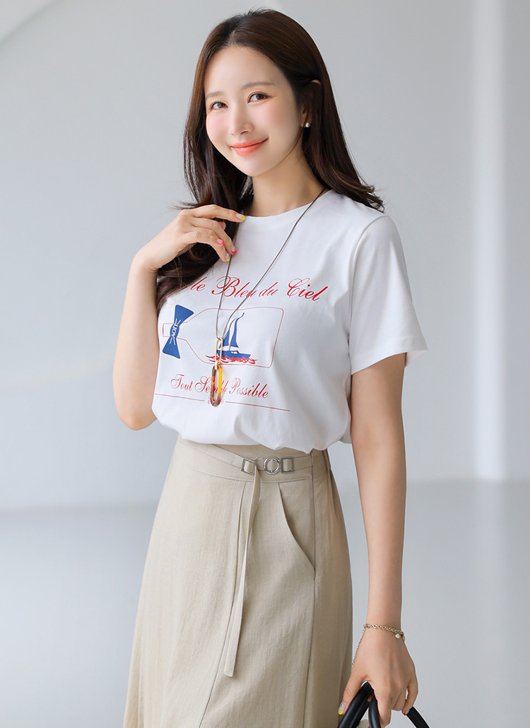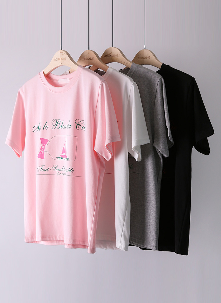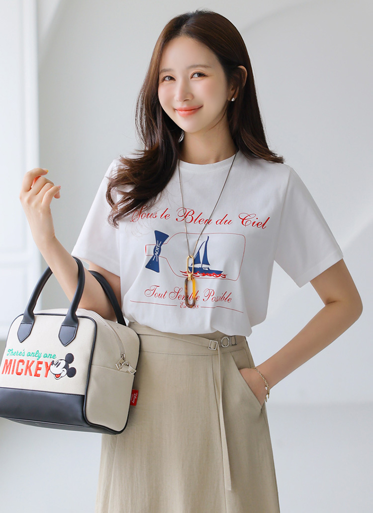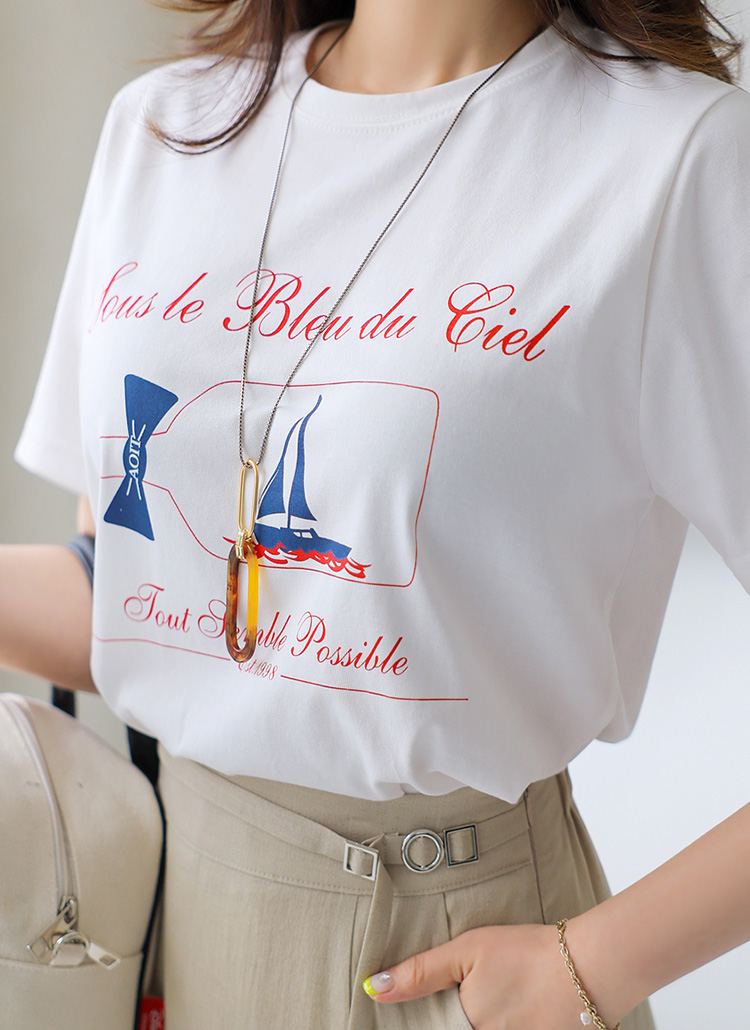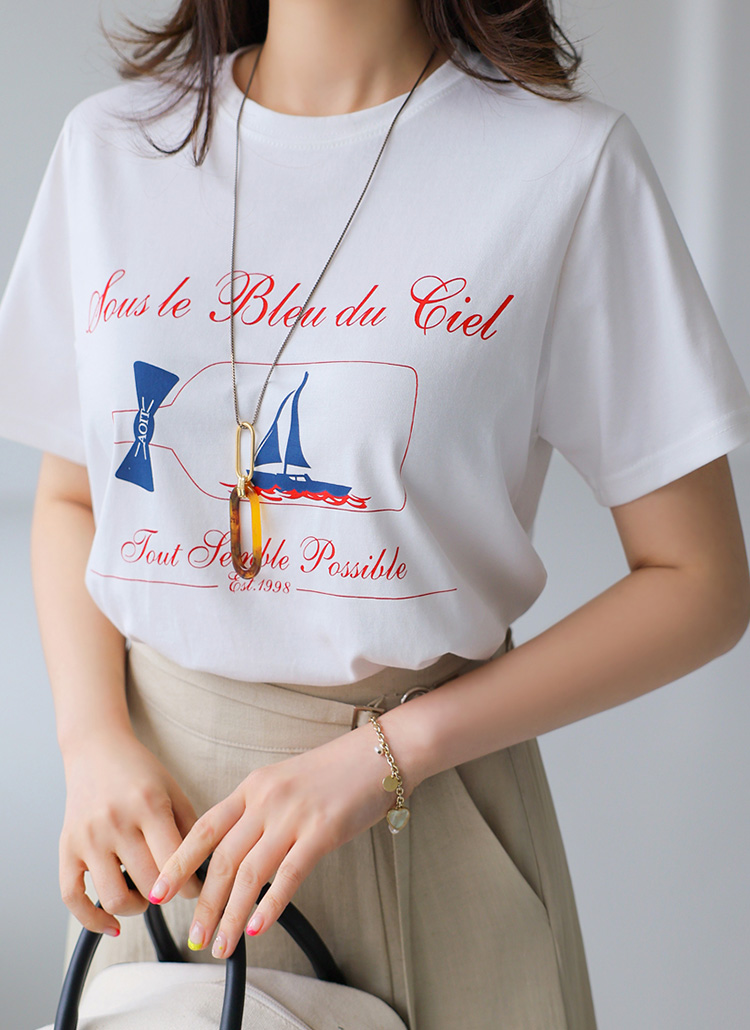 배 모양의 프린팅에 리본과 레터링이 더해져 프레시하고 감각적인 스타일을 선사하는 프린팅 티셔츠에요 :)