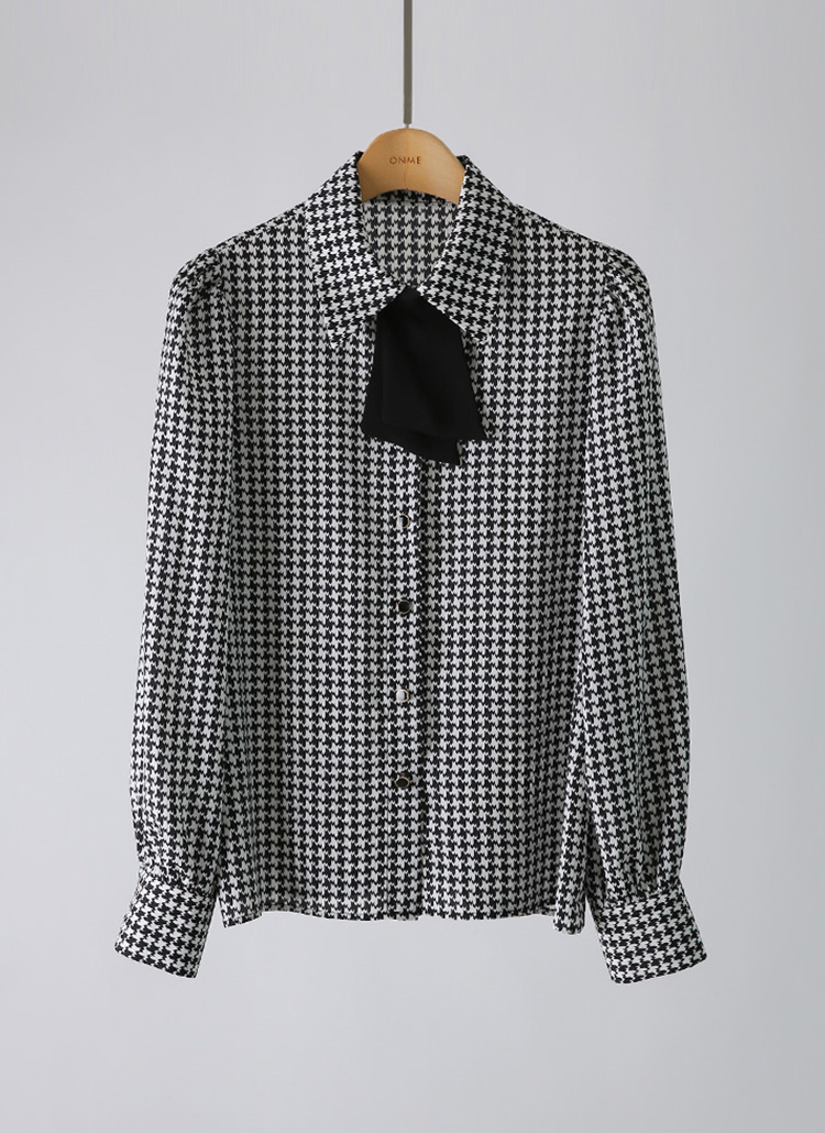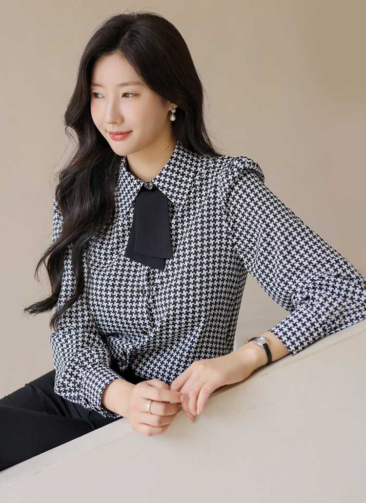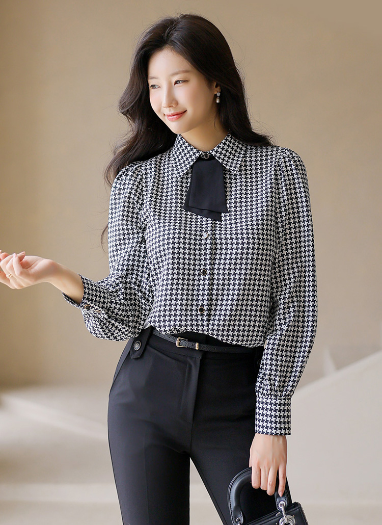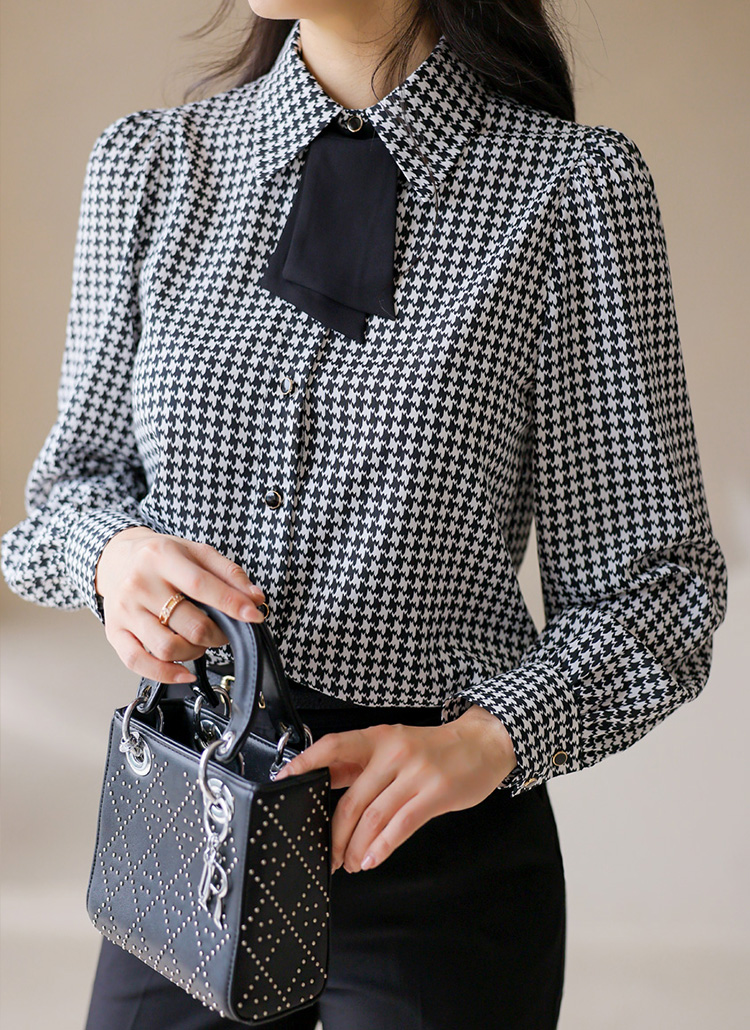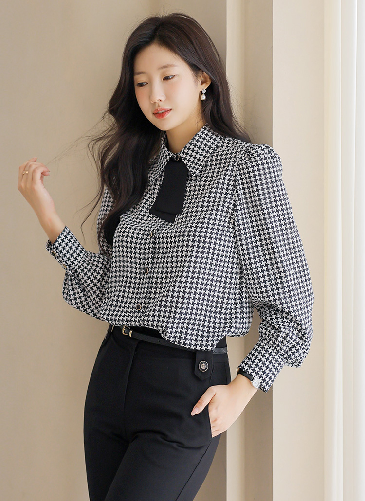 [LouisAngel] 2Way ボウタイ付き千鳥格子パフスリーブブラウス bl41848