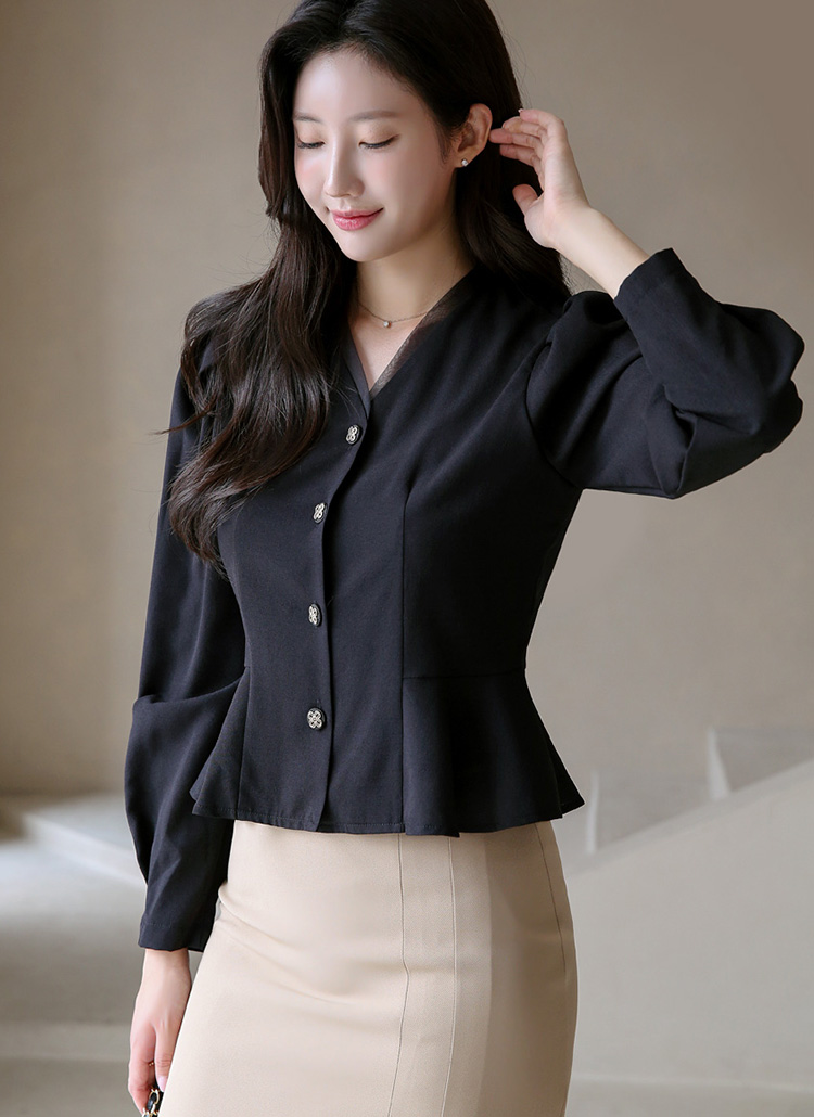 페플럼 디자인과 퍼프소매로 여성스러운 실루엣을 강조한