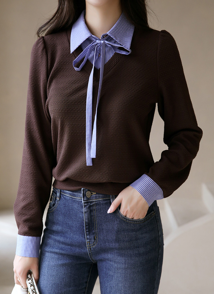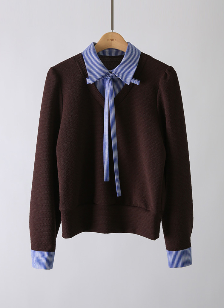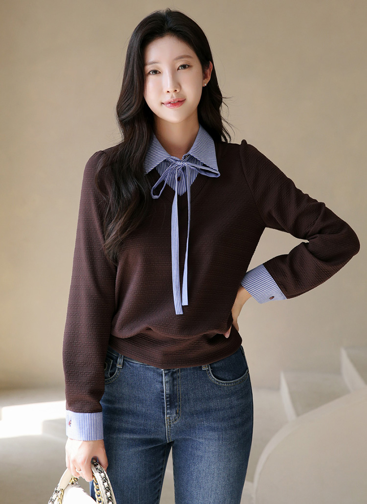 [LouisAngel] リボンタイストライプシャツドッキングふくれージャガードプルオーバー ts42004