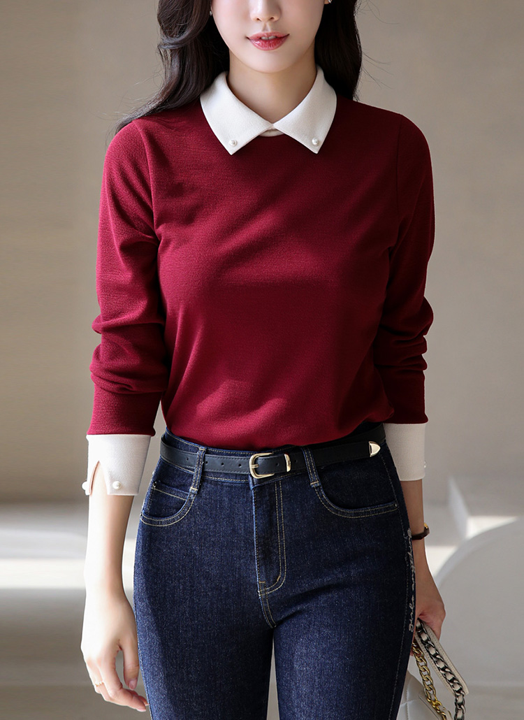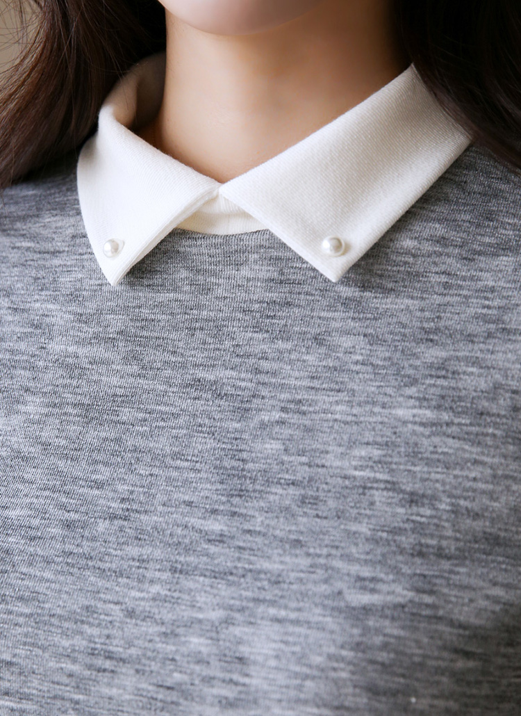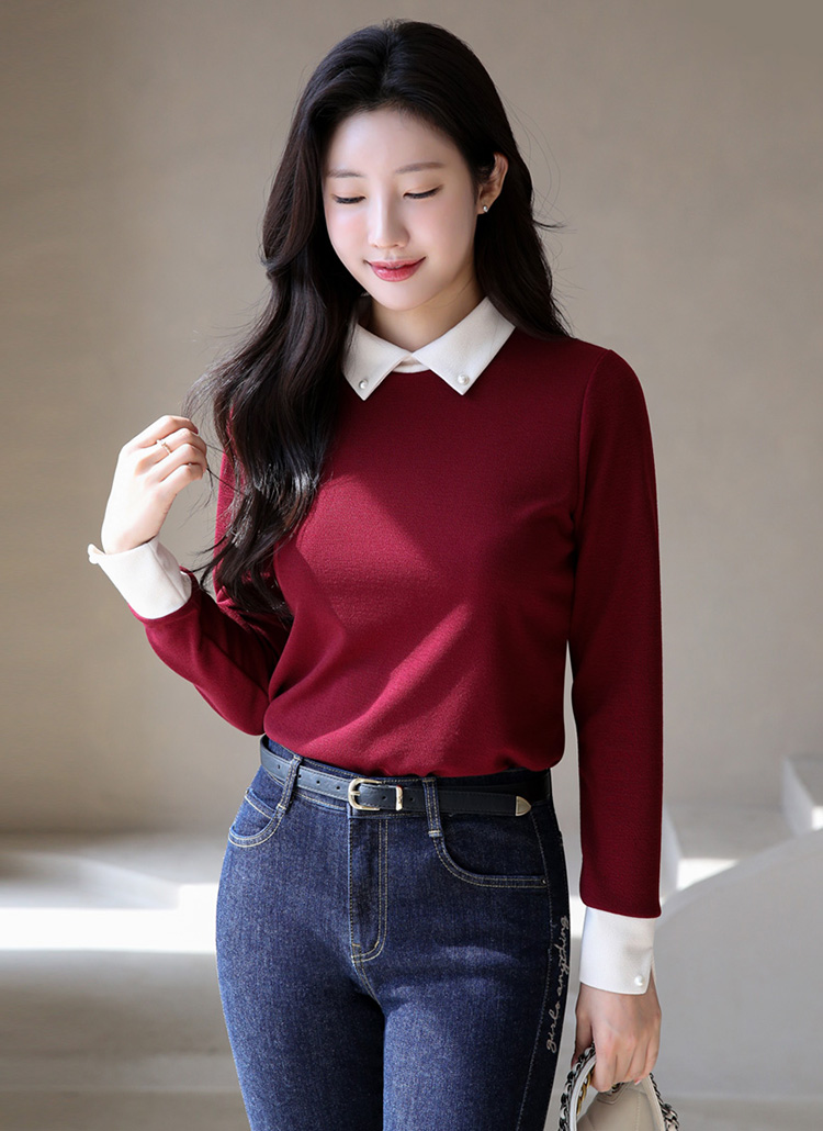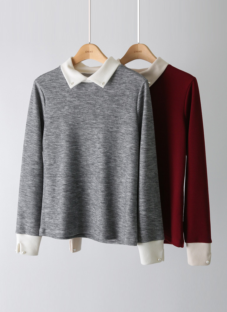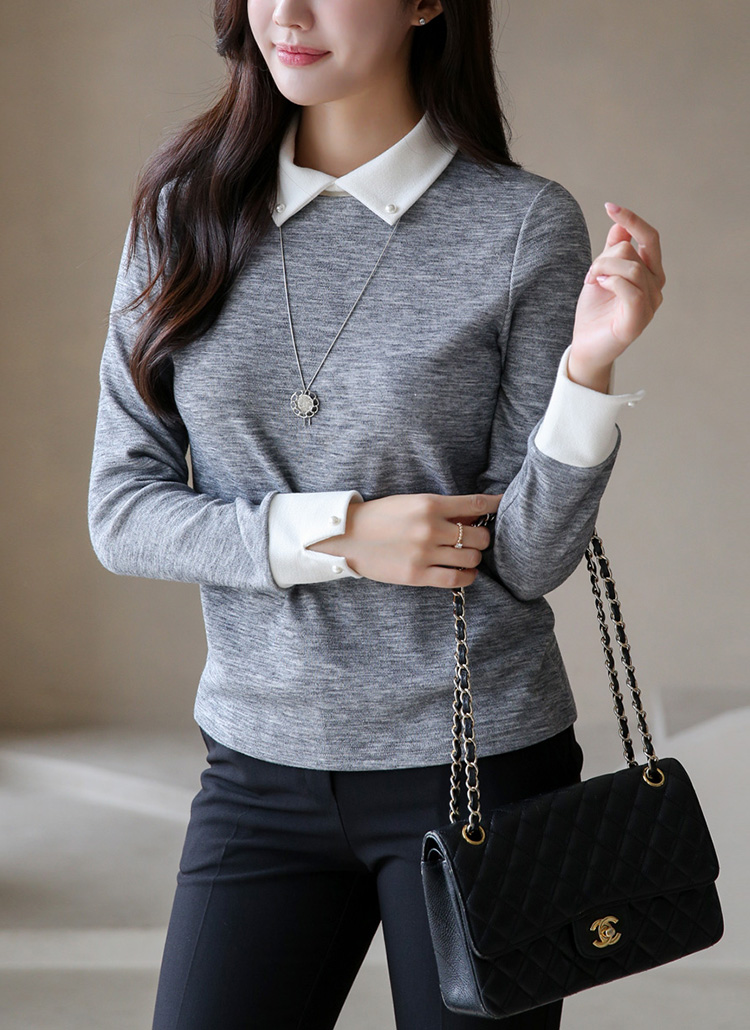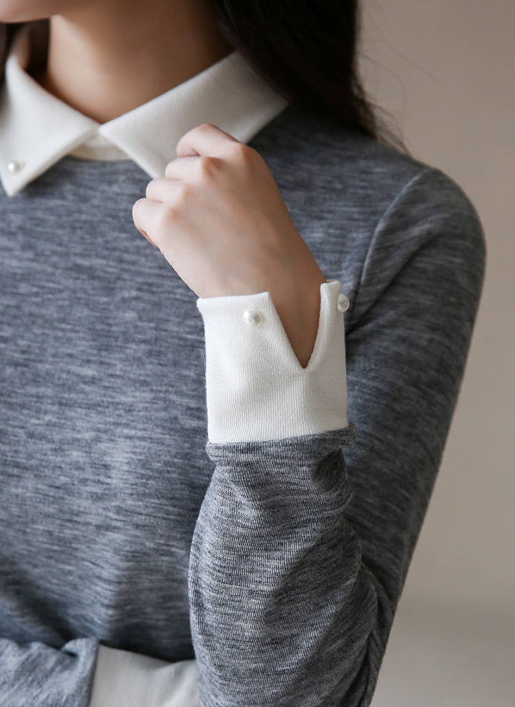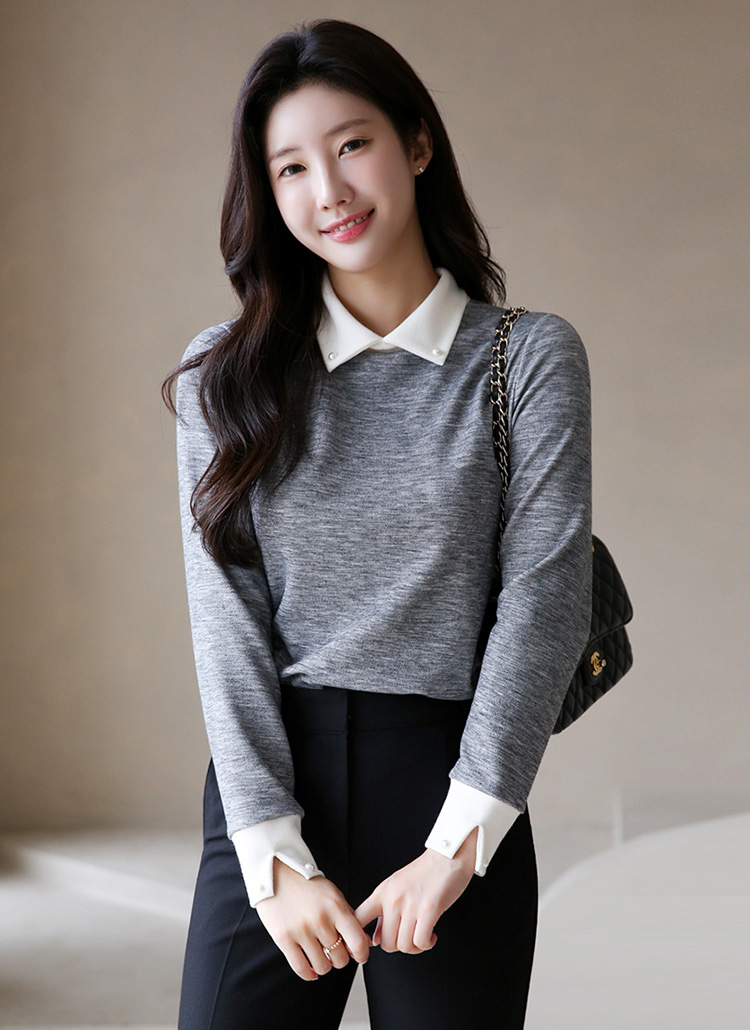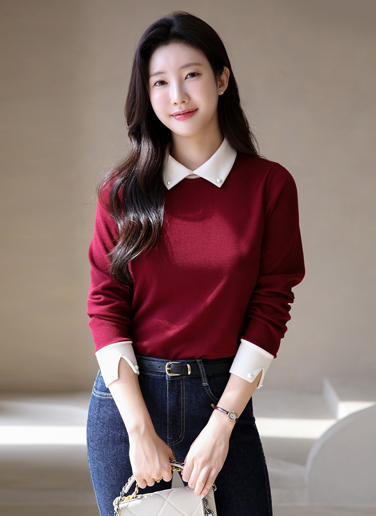 카라와 소매의 배색 포인트에 진주 디테일을 더해