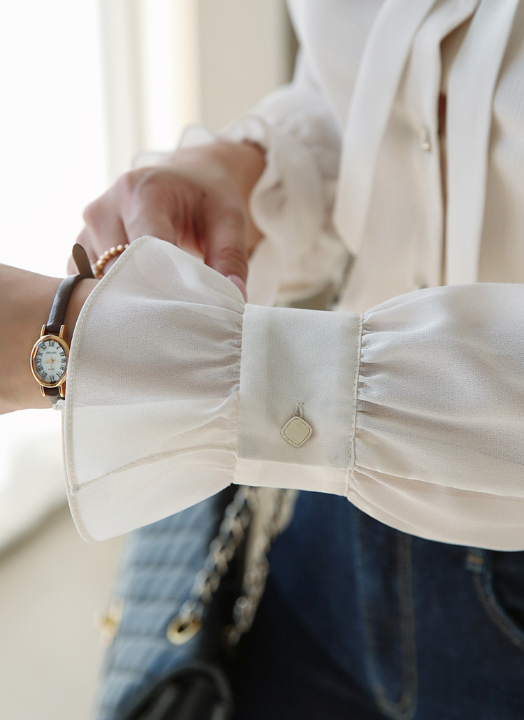 넥라인과 소매에 더해진 러플이 고급스러움을 더하며