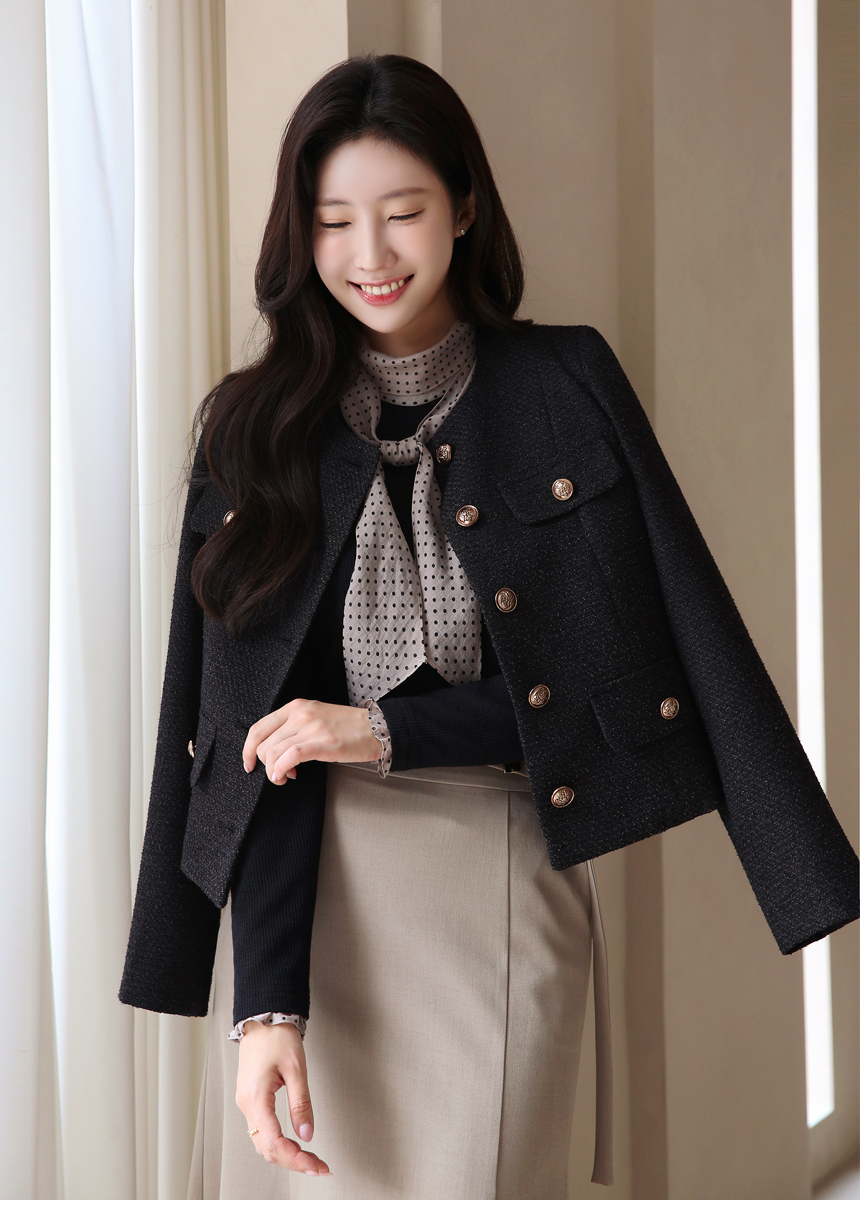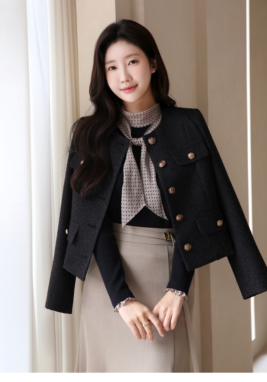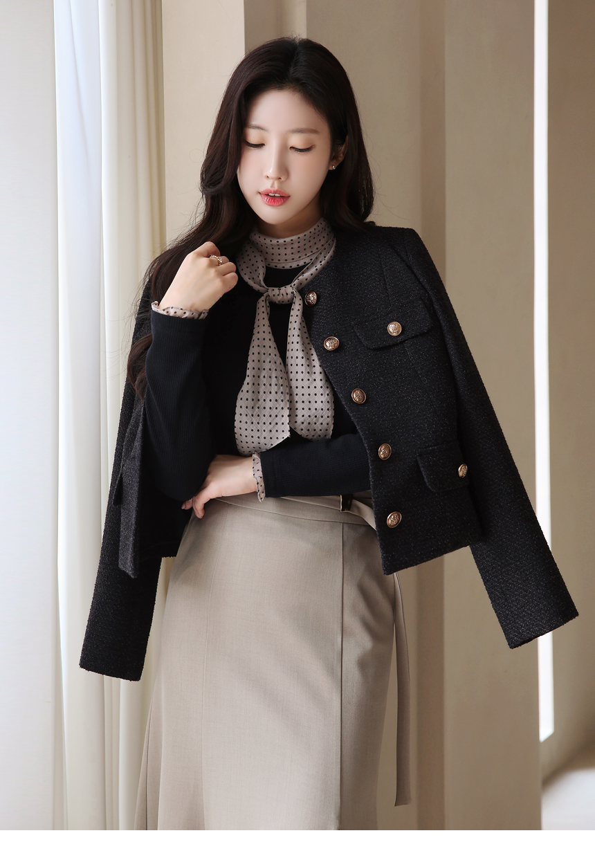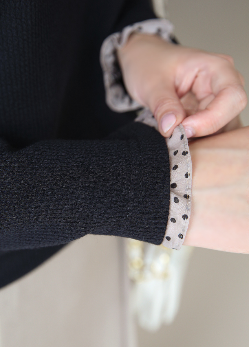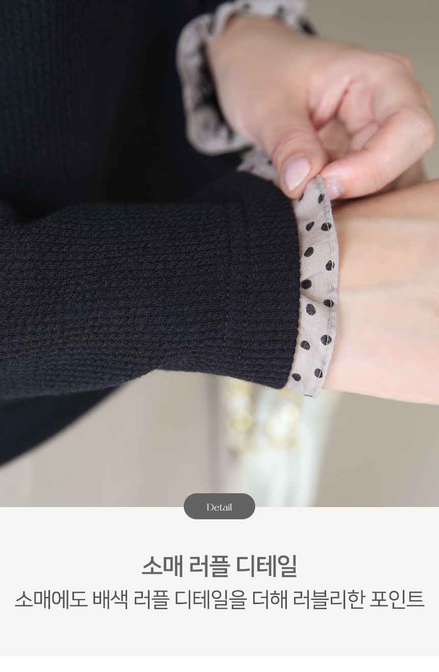 넥라인과 소매에 도트 레이어드로 러블리한 무드를 연출하는