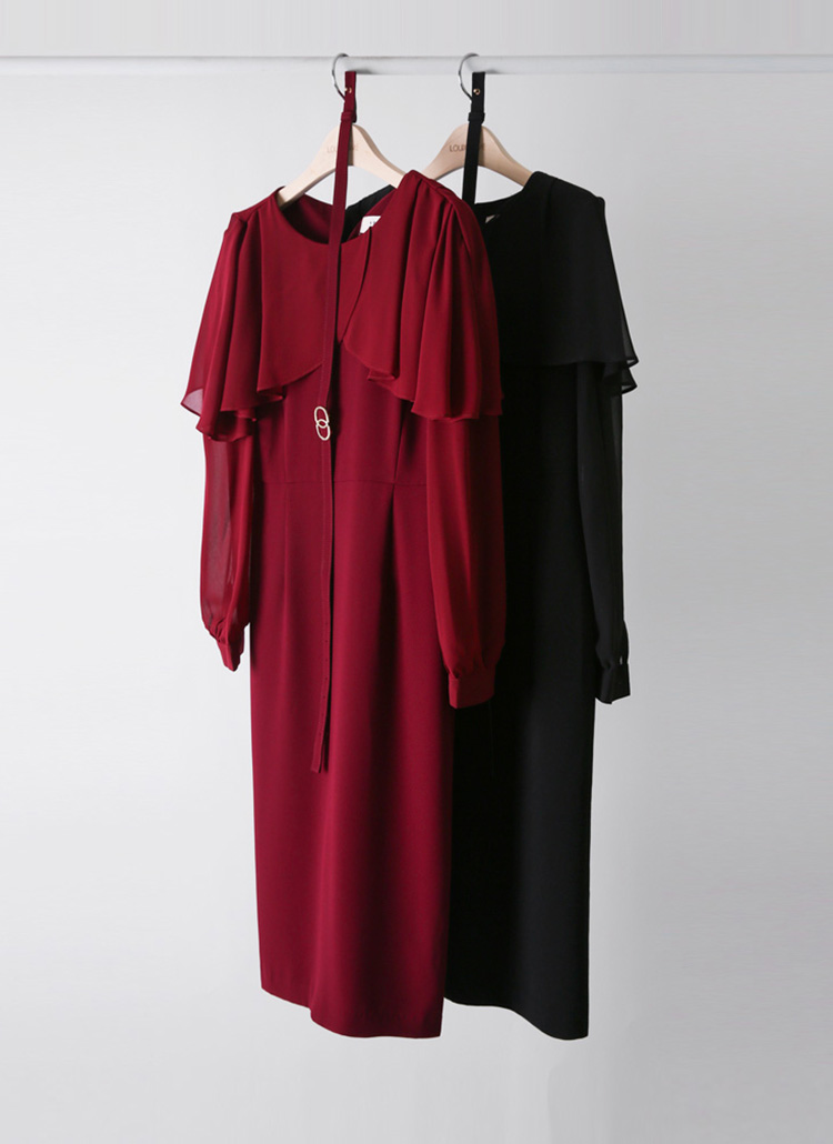 아방가르드하고 럭셔리한 페미닌 무드를 선사하는 쉬폰 케이프 숄더 디자인으로