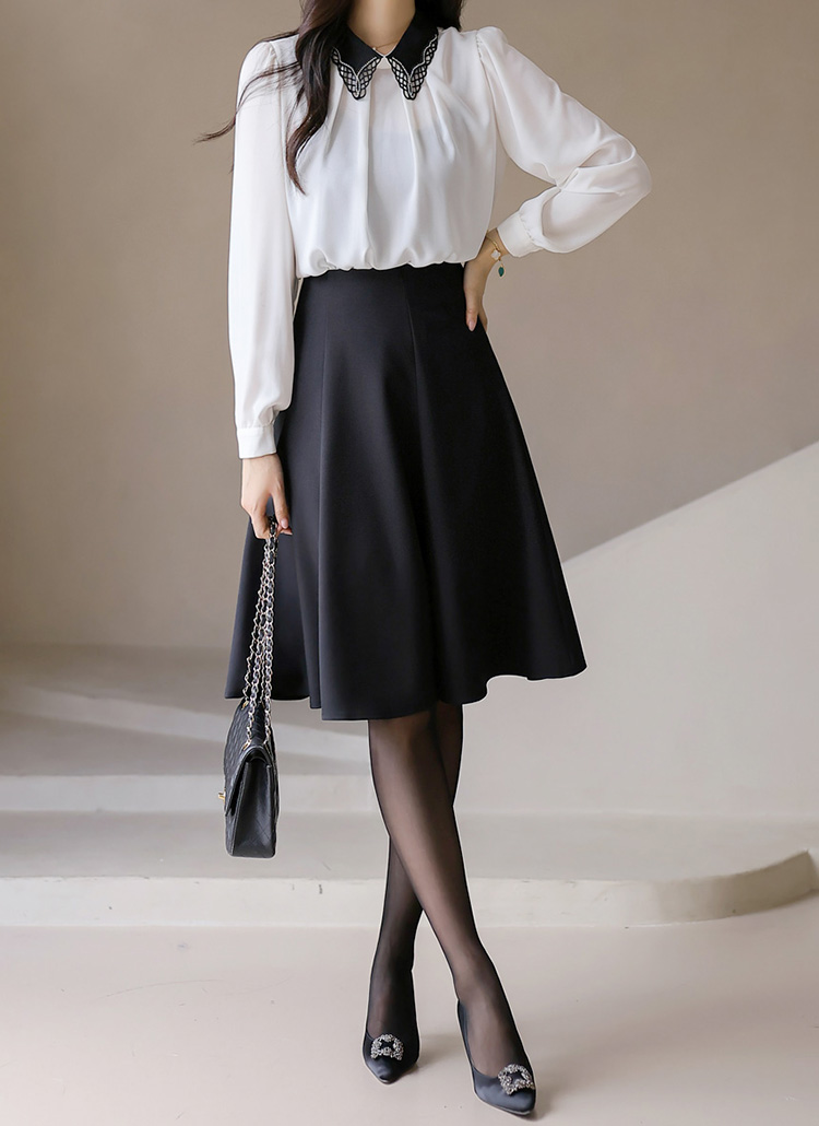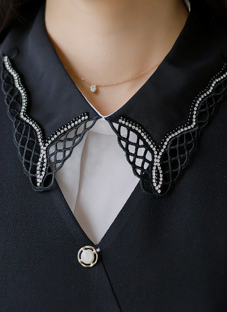 큐빅과 레이스 디테일이 더해진 카라로 멋스럽게 룩을 완성하는