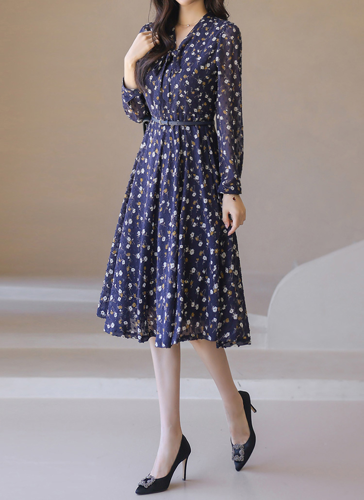 ベルト付き フラワージャガード リボンタイフレアワンピース op42184