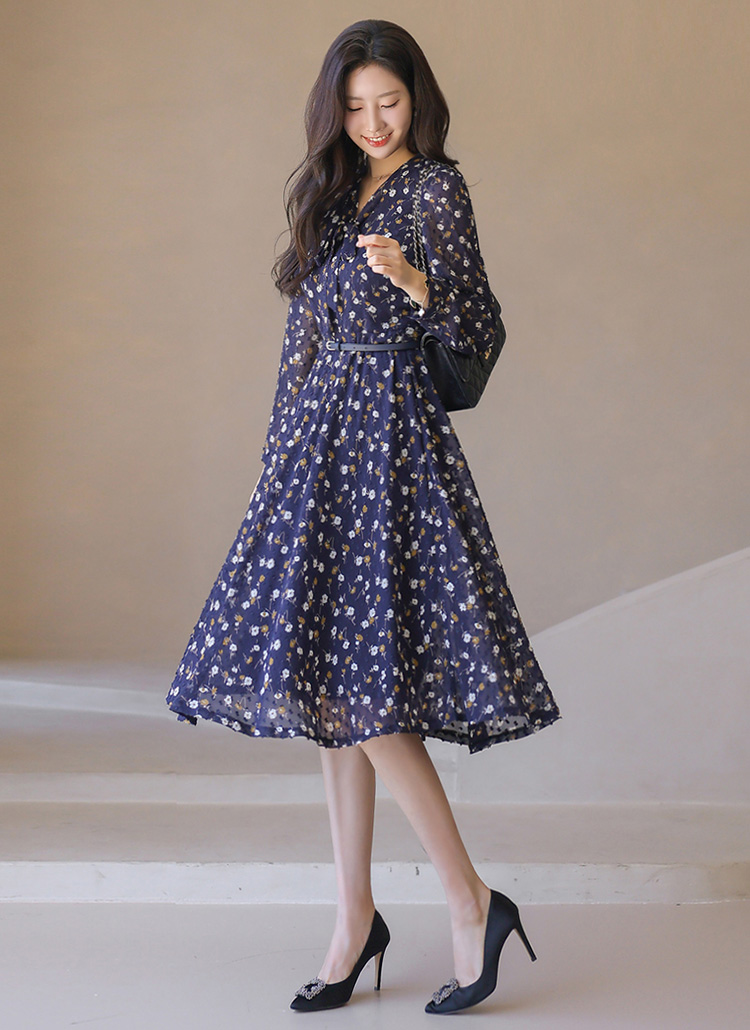 ベルト付き フラワージャガード リボンタイフレアワンピース op42184
