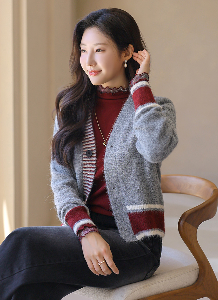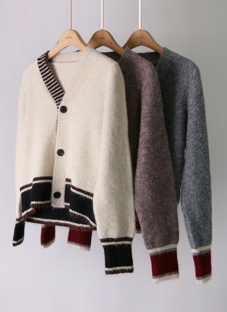 포근한 울 블렌딩 소재에 세련된 배색 디자인이 돋보이는 니트 가디건이에요 :)