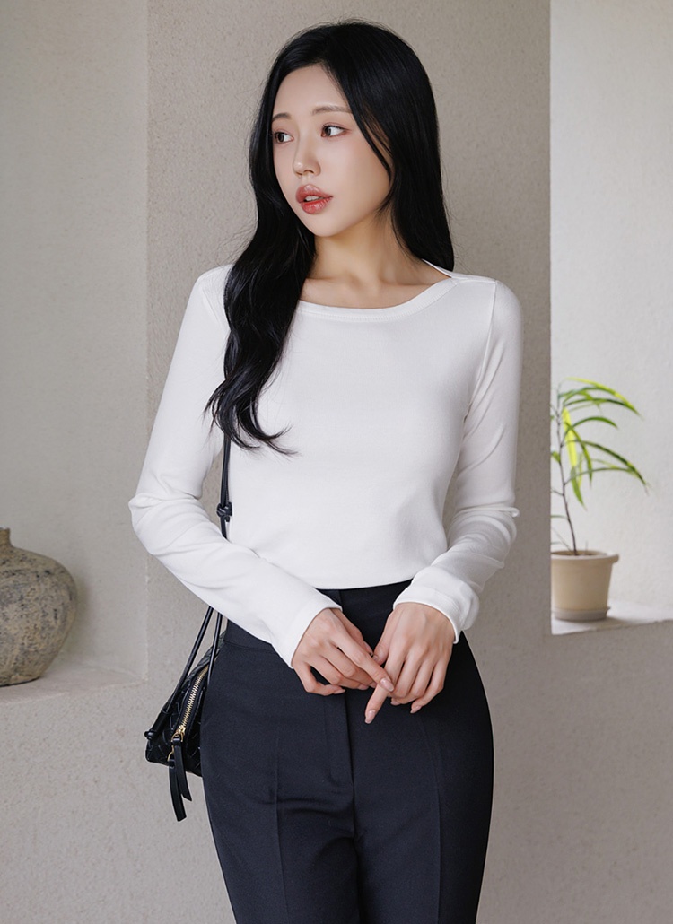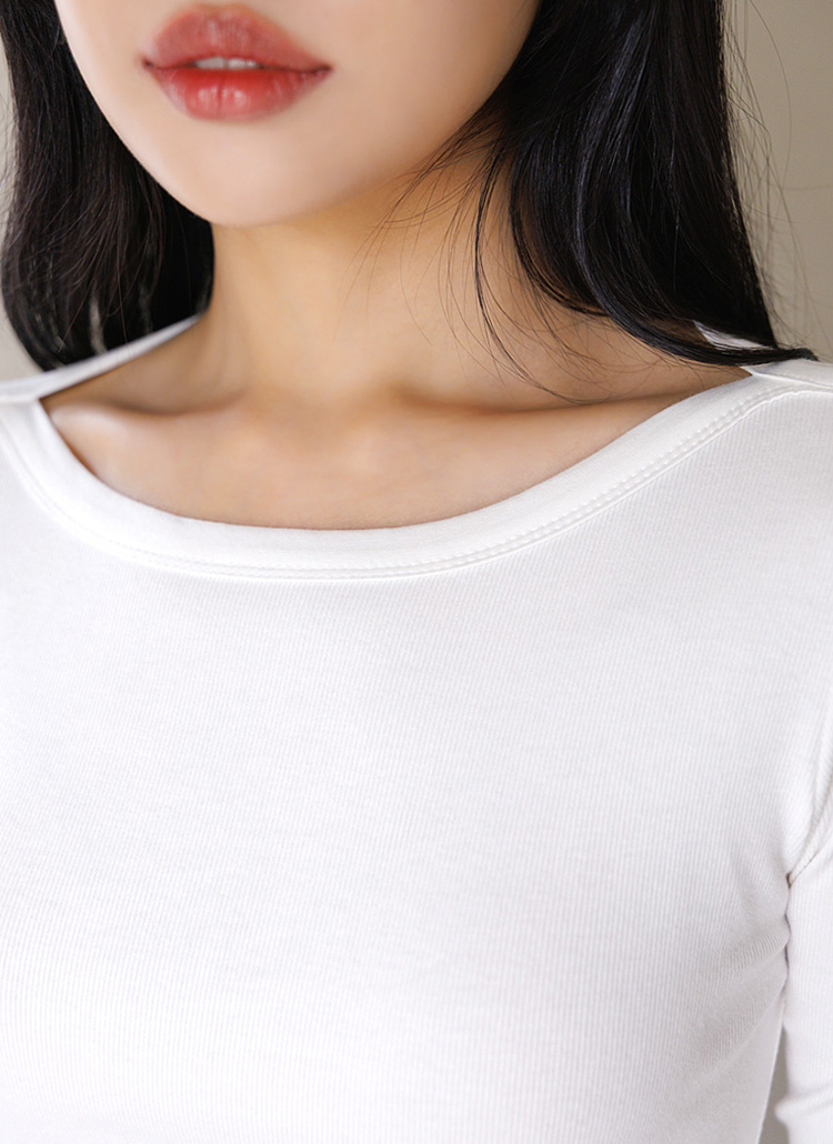 보트넥 디자인으로 목선을 여리하게 드러내며