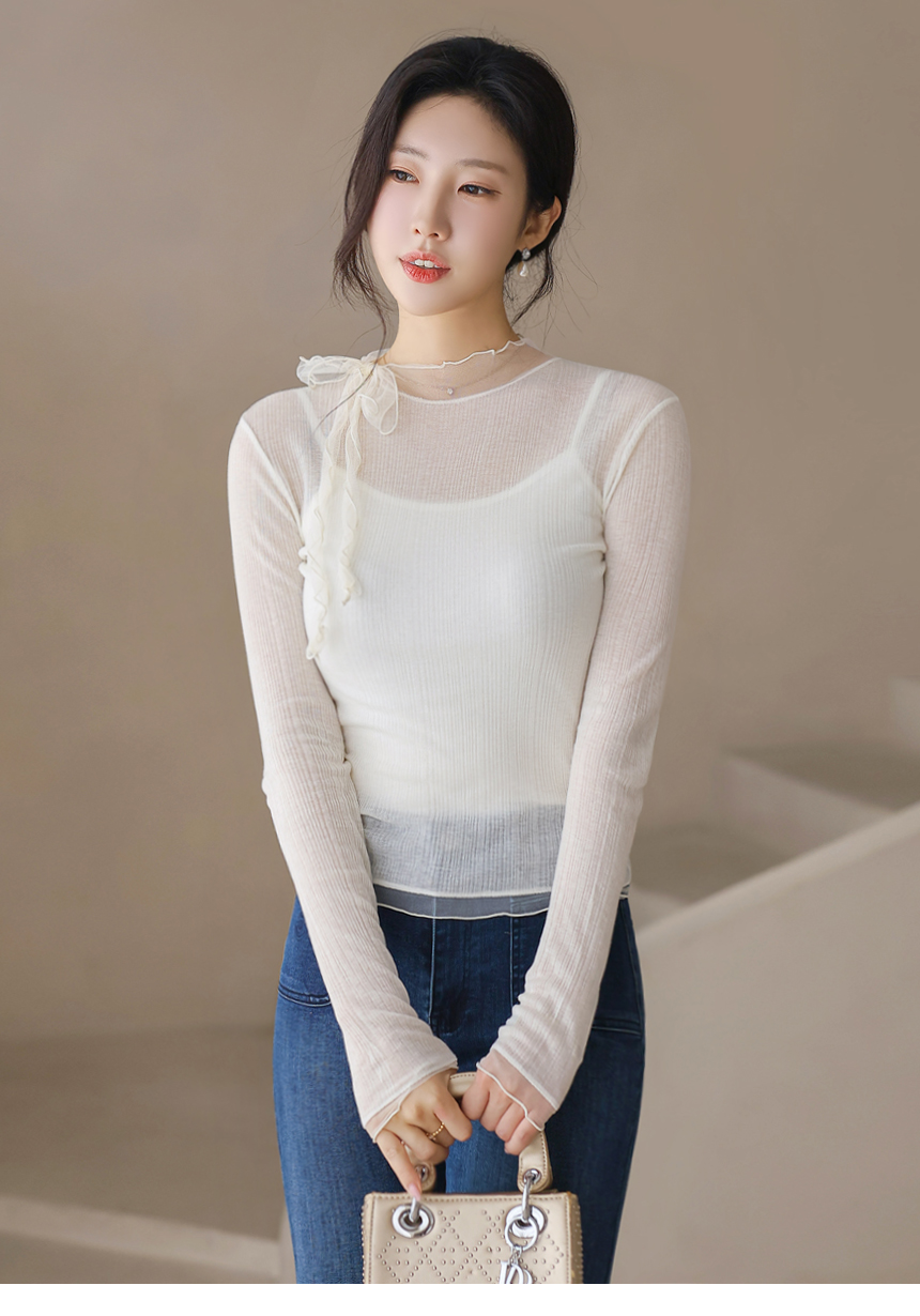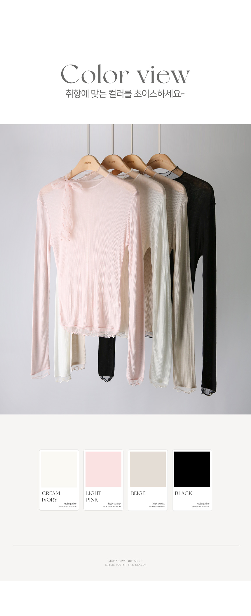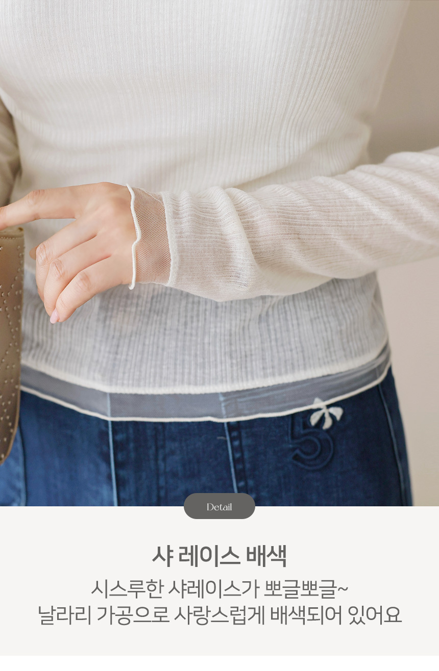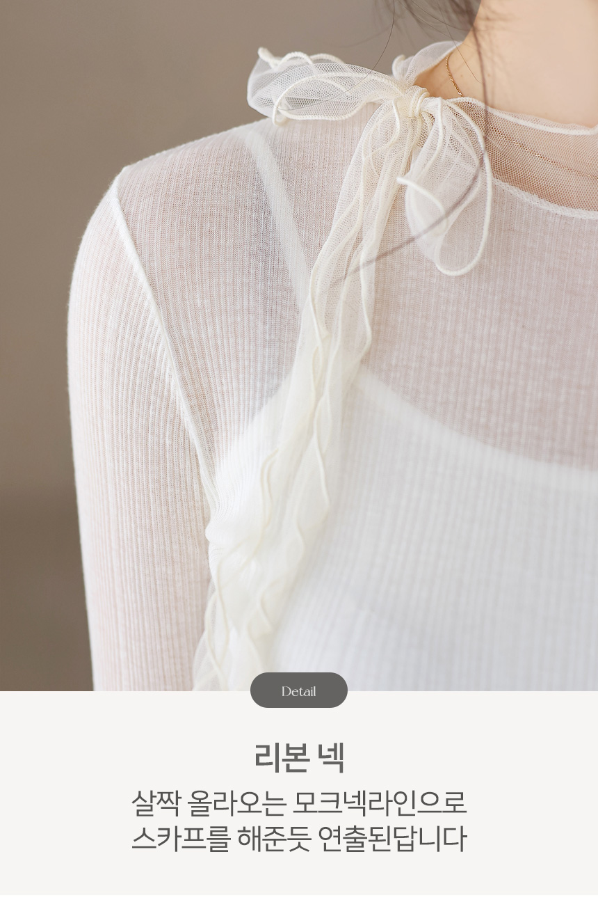 시스루 레이스 배색과 넥라인 리본 디테일로