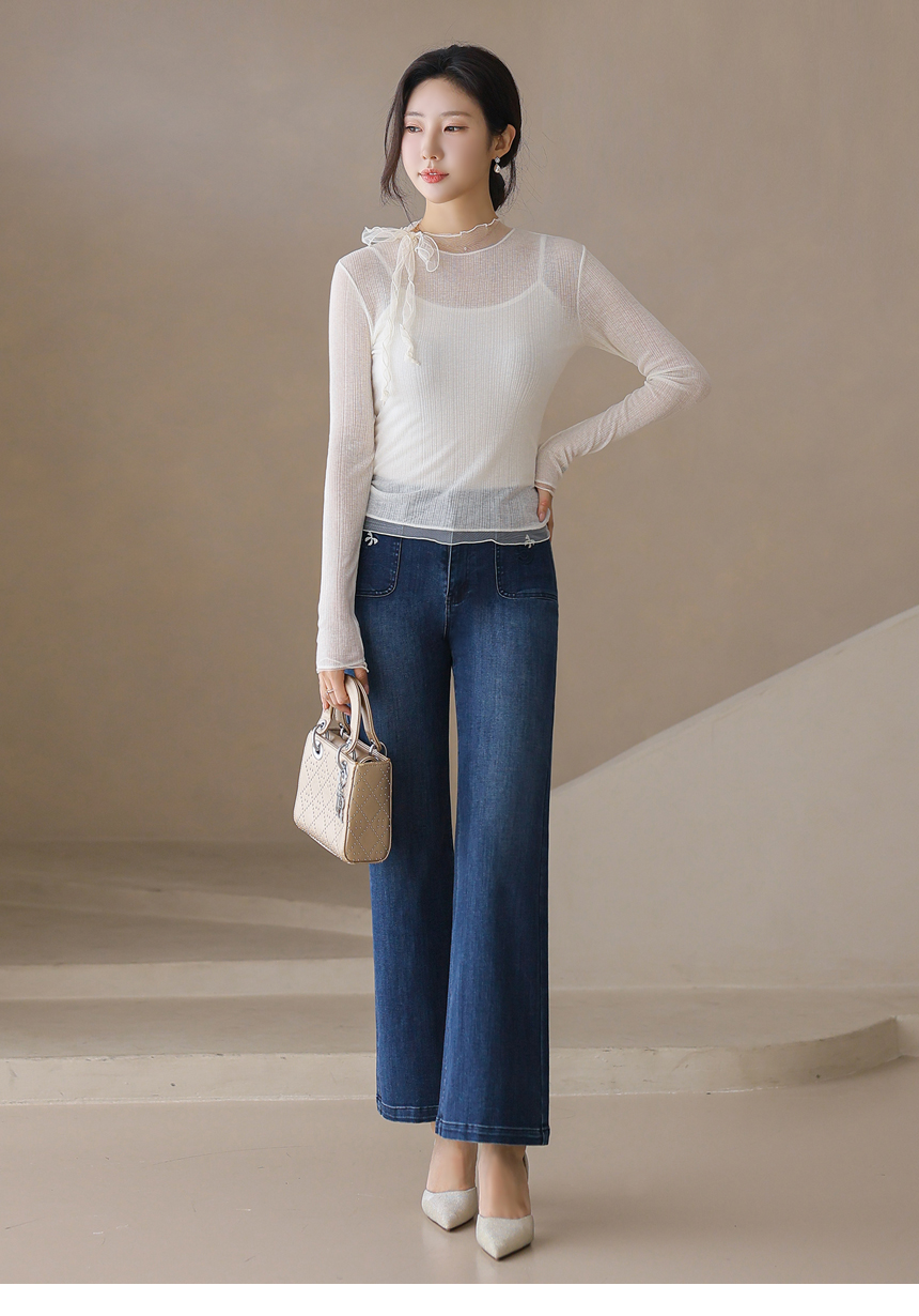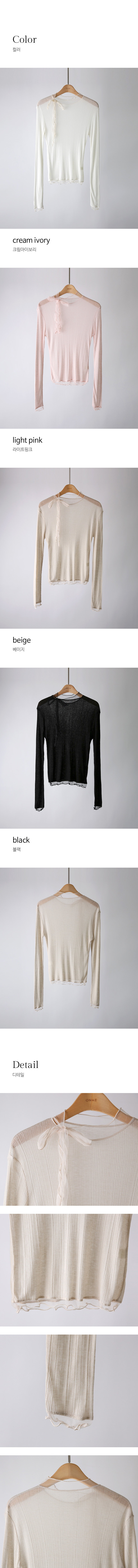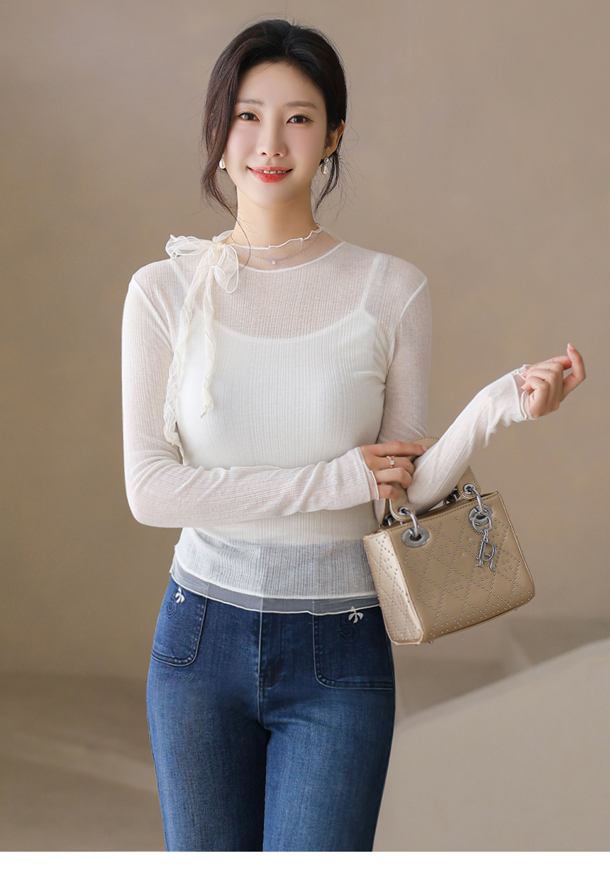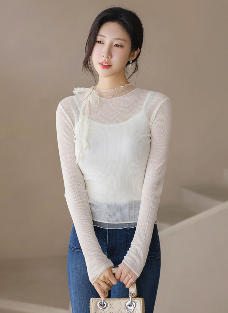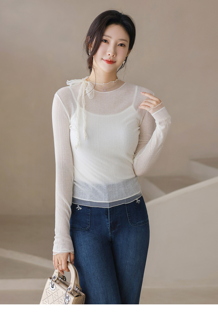 시스루 레이스 배색과 넥라인 리본 디테일로