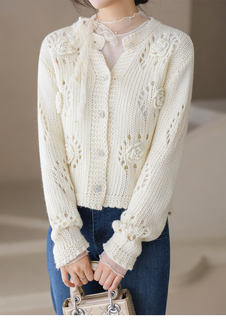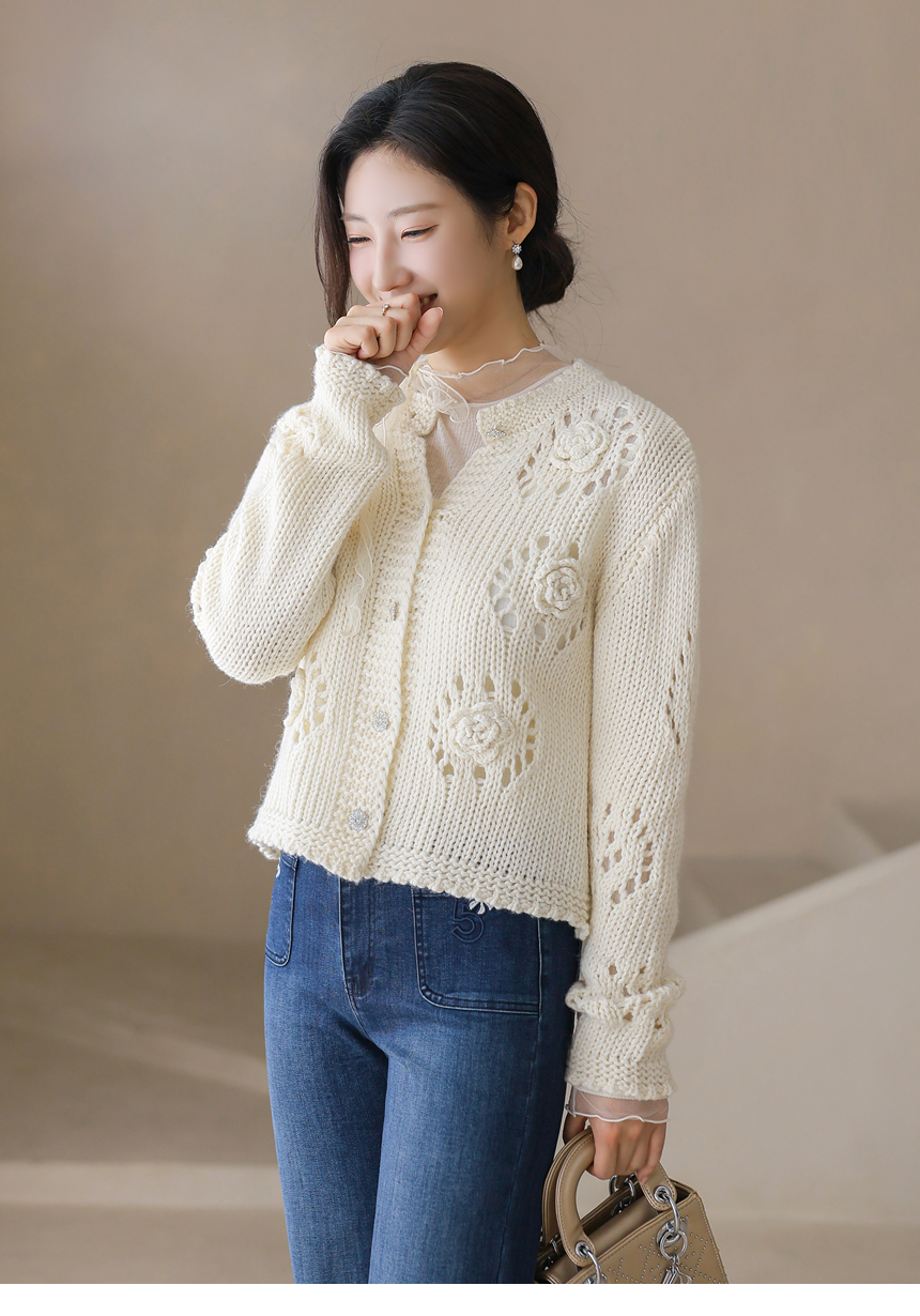 • ウールブレンド フラワークロシェ編みニットカーディガン cd42277