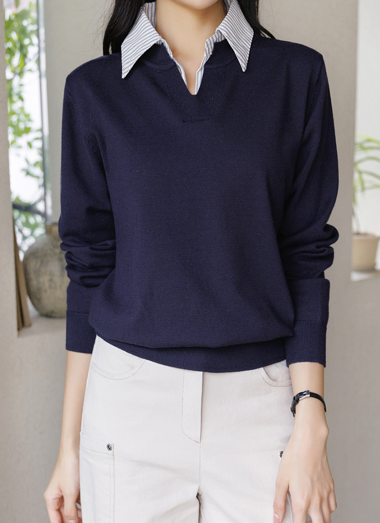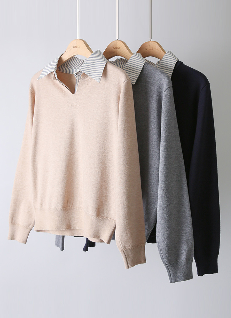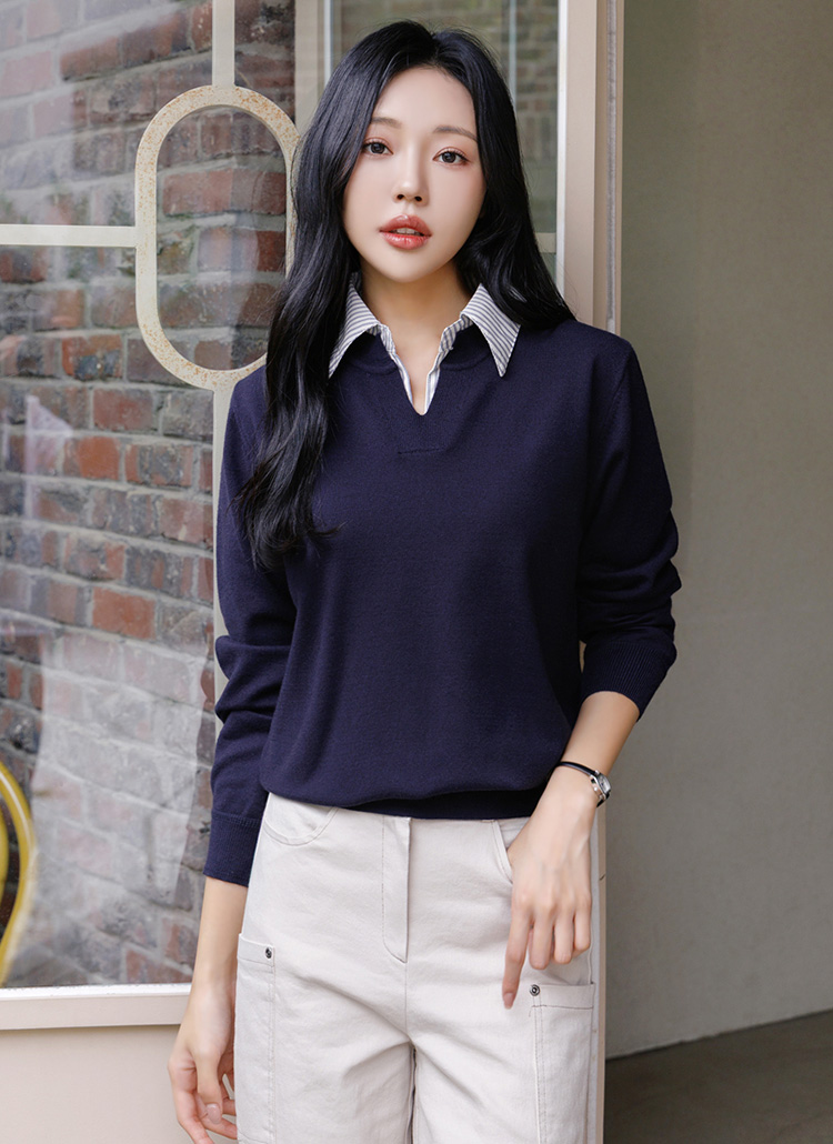 트렌디한 스트라이프 카라 레이어드로 산뜻한 포인트를 준