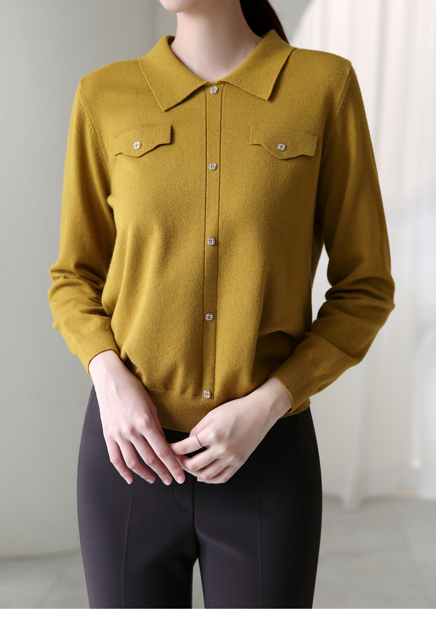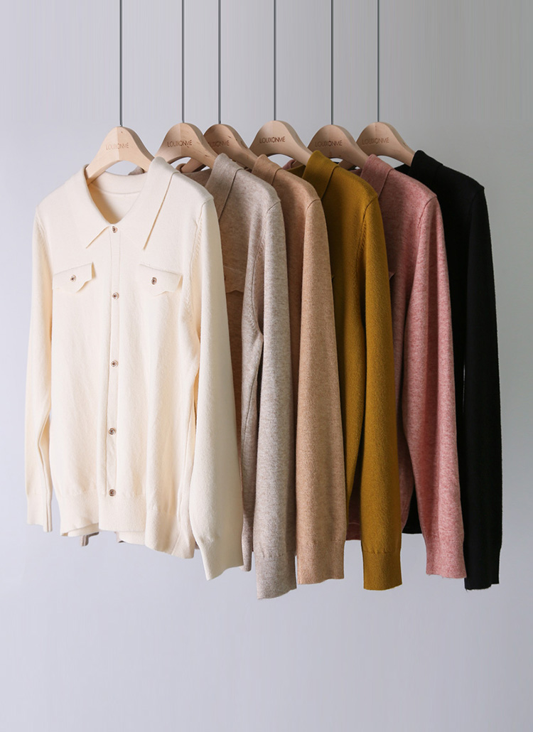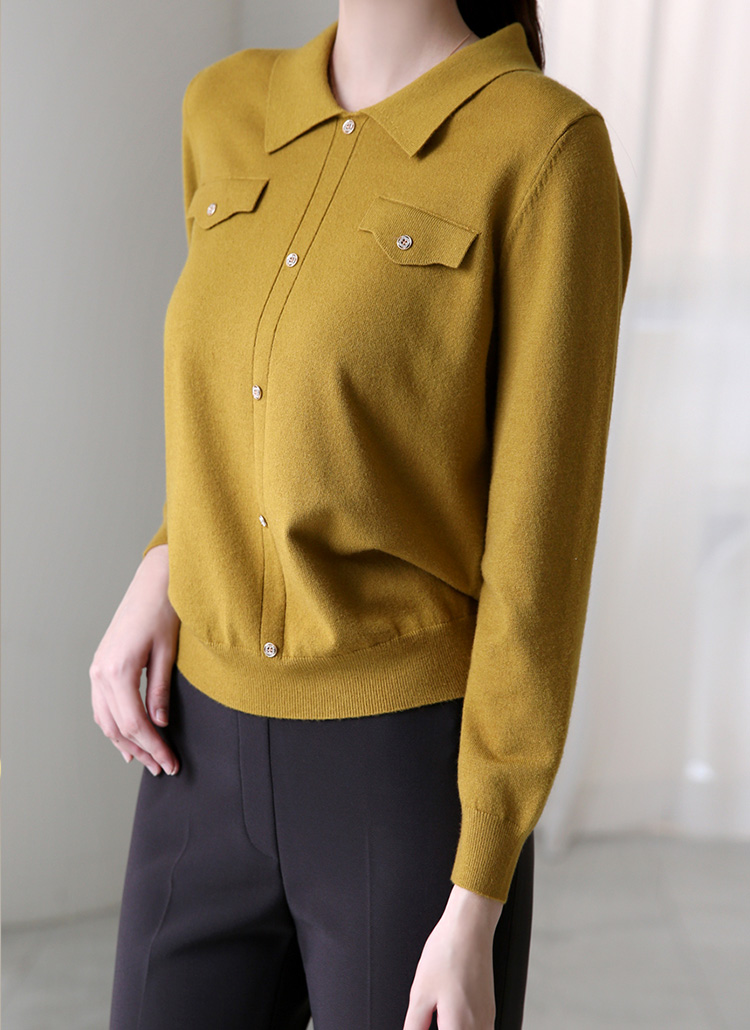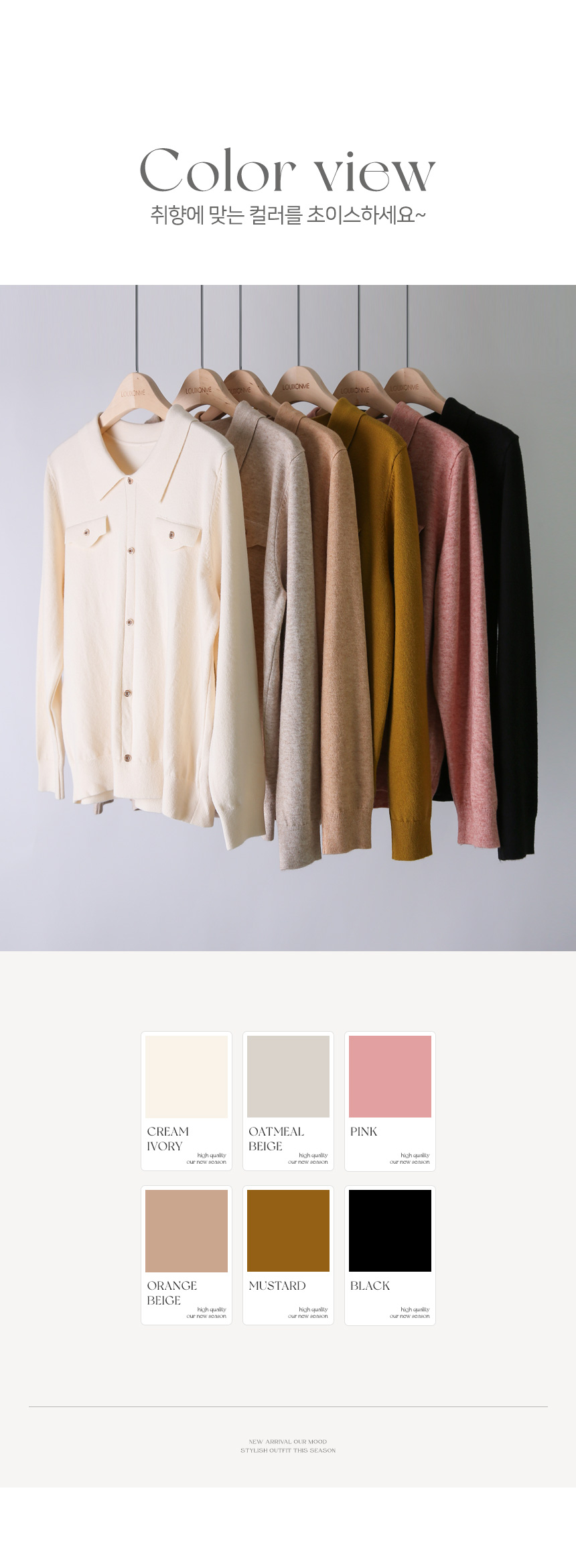 깔끔한 카라넥에 골드 버튼 디테일로 가볍게 꾸며준 듯 멋스럽게 입기 좋은 니트에요 :)