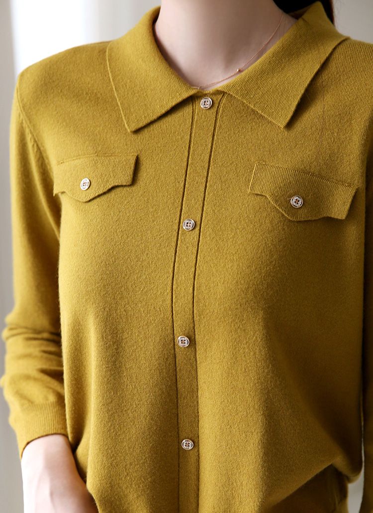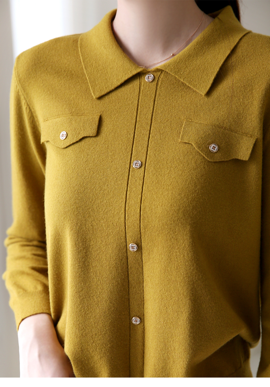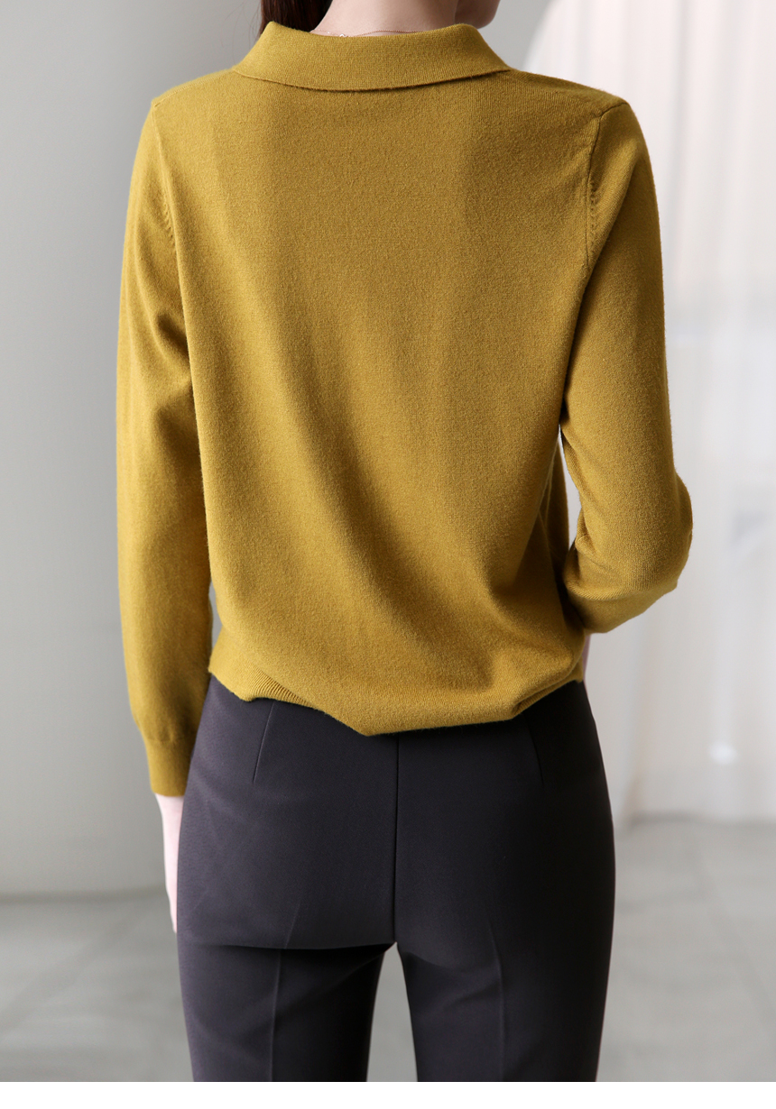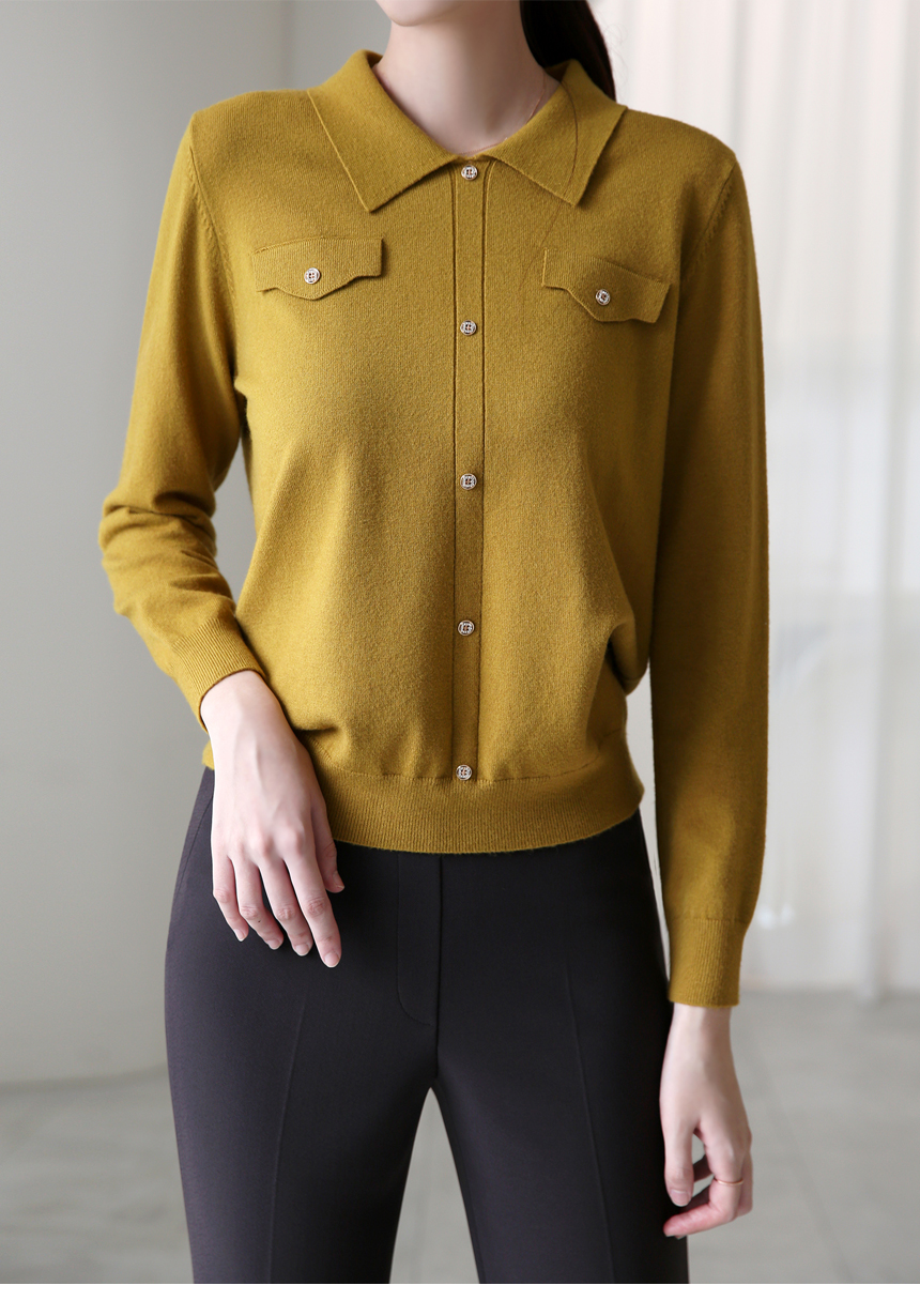 깔끔한 카라넥에 골드 버튼 디테일로 가볍게 꾸며준 듯 멋스럽게 입기 좋은 니트에요 :)