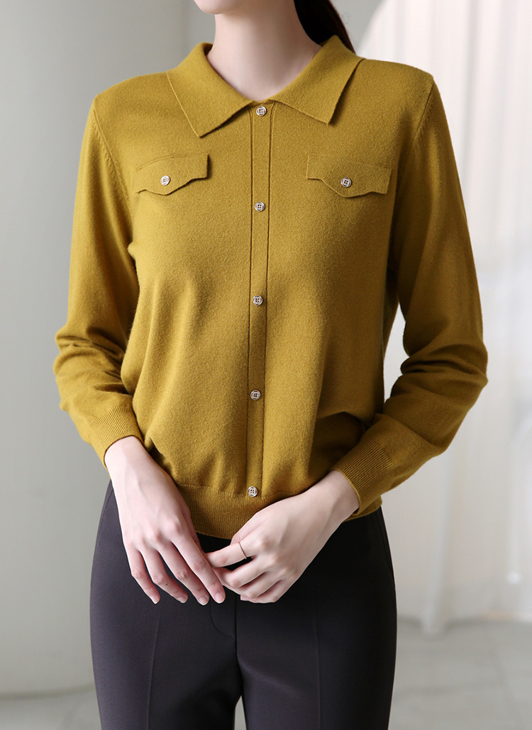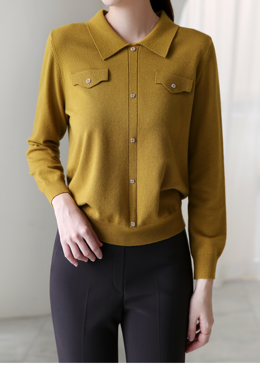 【6色展開】フェイクカーディガンデザイン ビジュー釦 ポロカラーニット nt42343