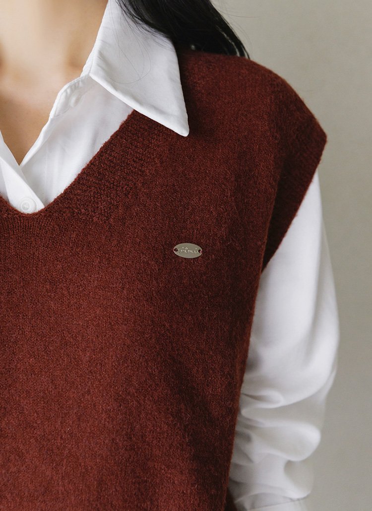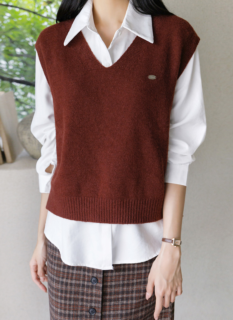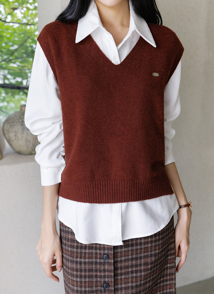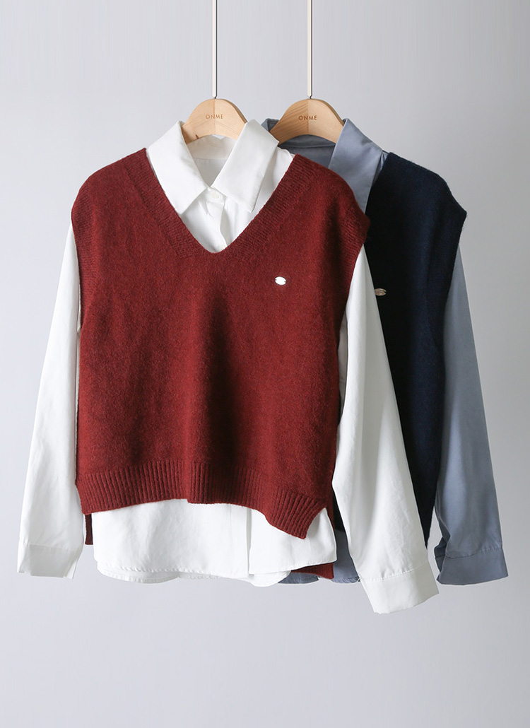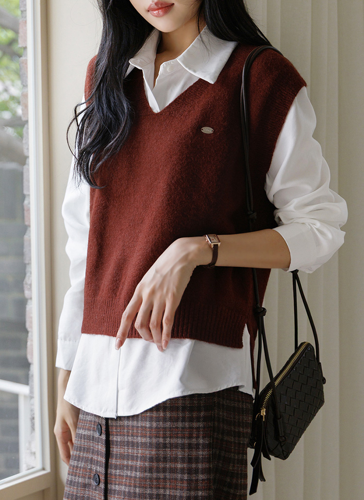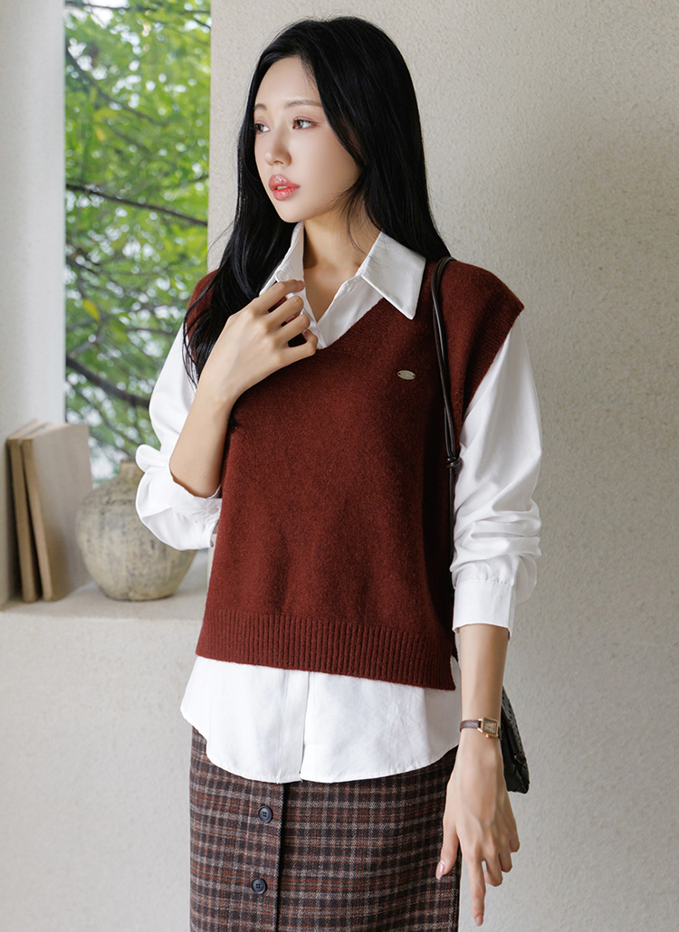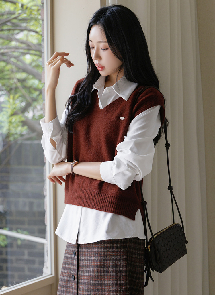 【2点特価】[THE ONME] ペンダント付きVネックニットベスト&シャツブラウスセットアップ SET42382