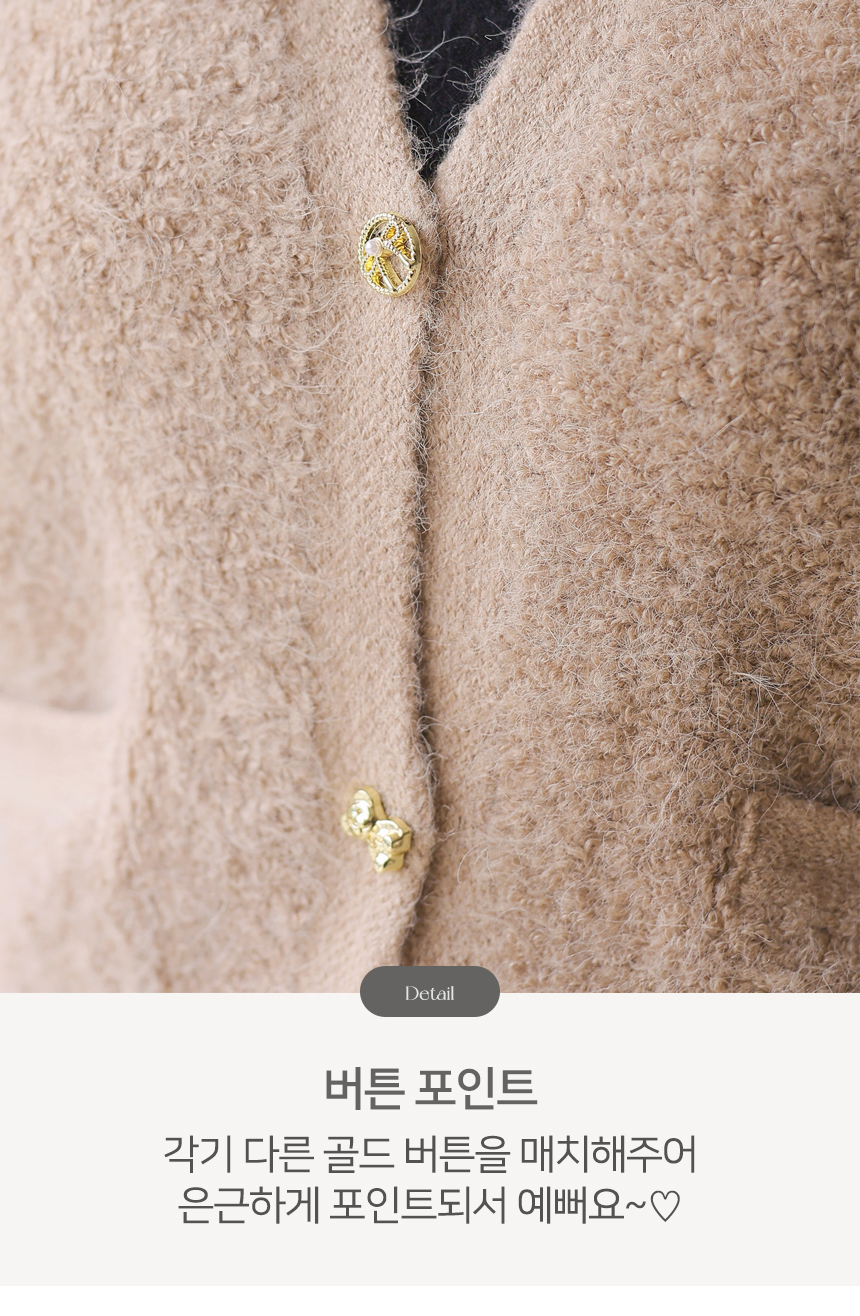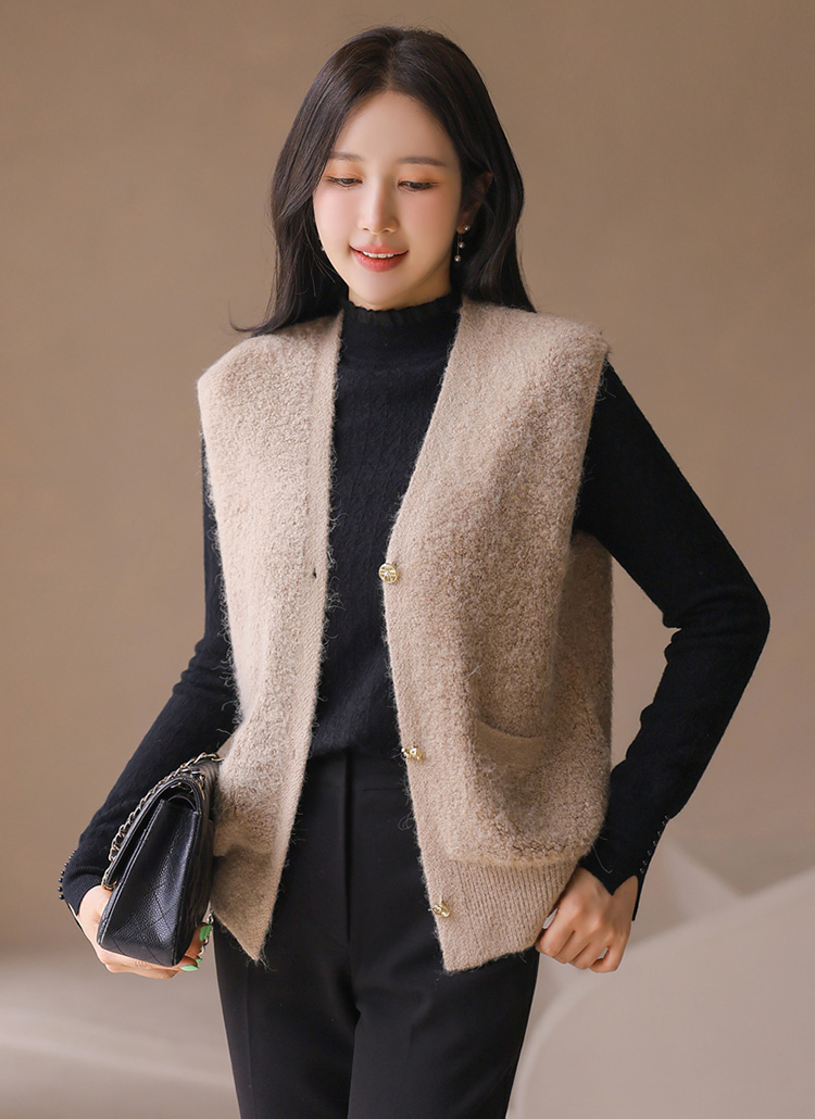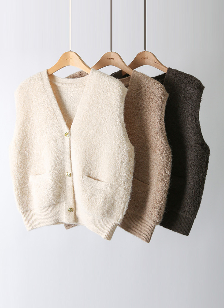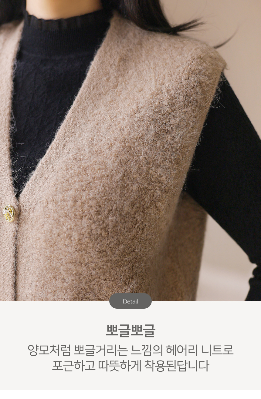 포근한 울 블렌딩 소재에 골드 버튼으로 포인트를 준 뽀글뽀글 니트 조끼에요 :)