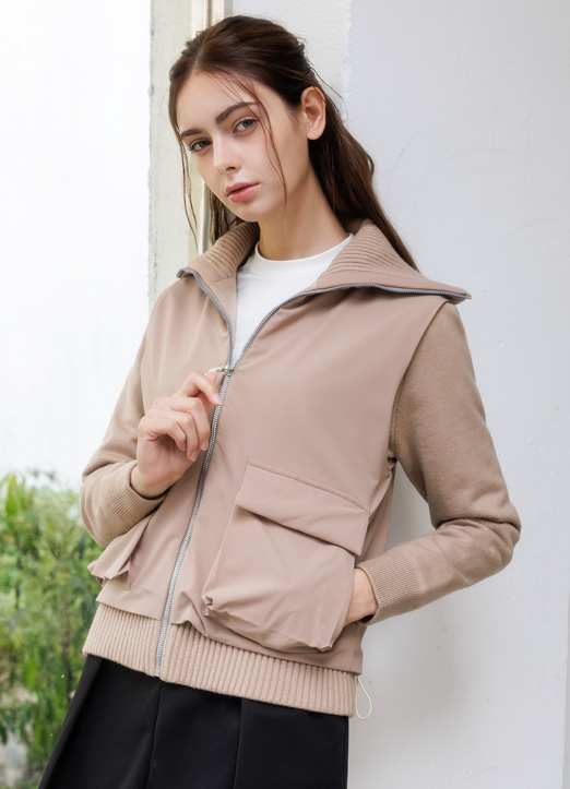 【防風ニット】[QoG] レイヤード風 ニットドッキング フラップポケットジップアップジャケットjp42403