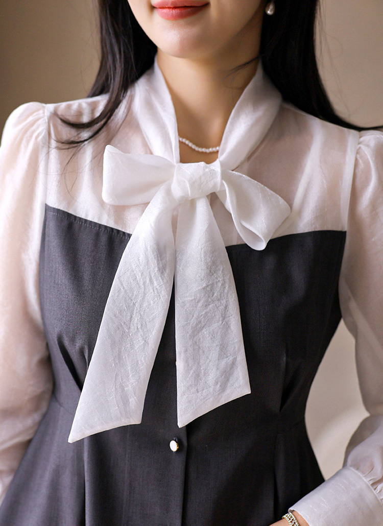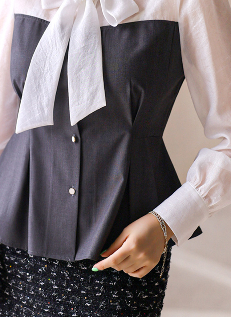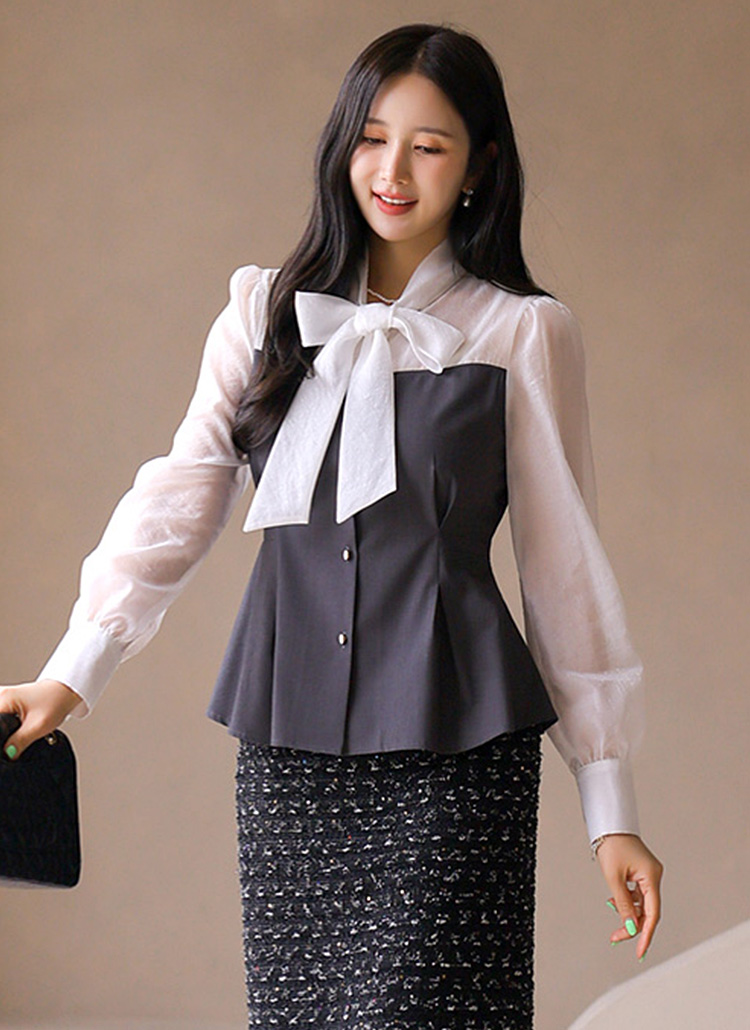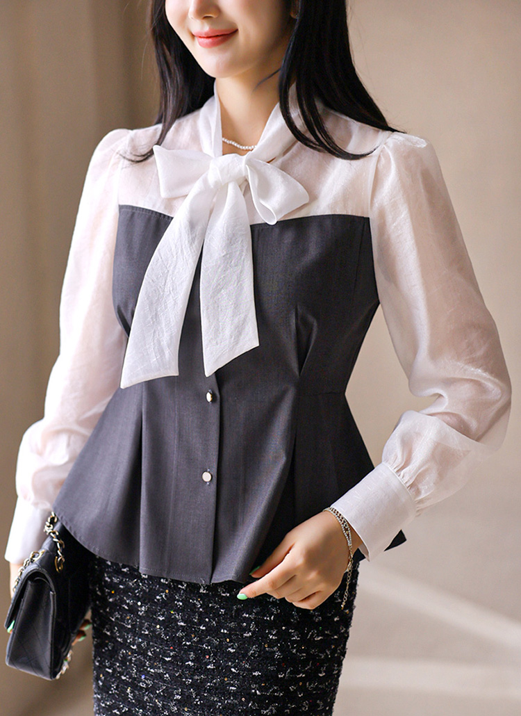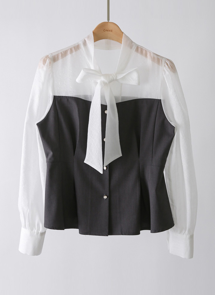[LouisAngel] オーガンジーリボンタイバイカラーペプラムブラウス bl42529