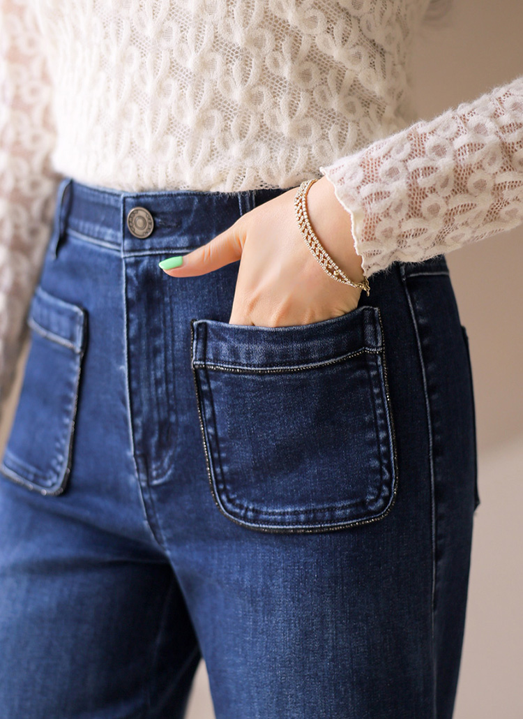 아웃포켓을 따라 들어간 비즈 라인이 반짝이며 포인트되어