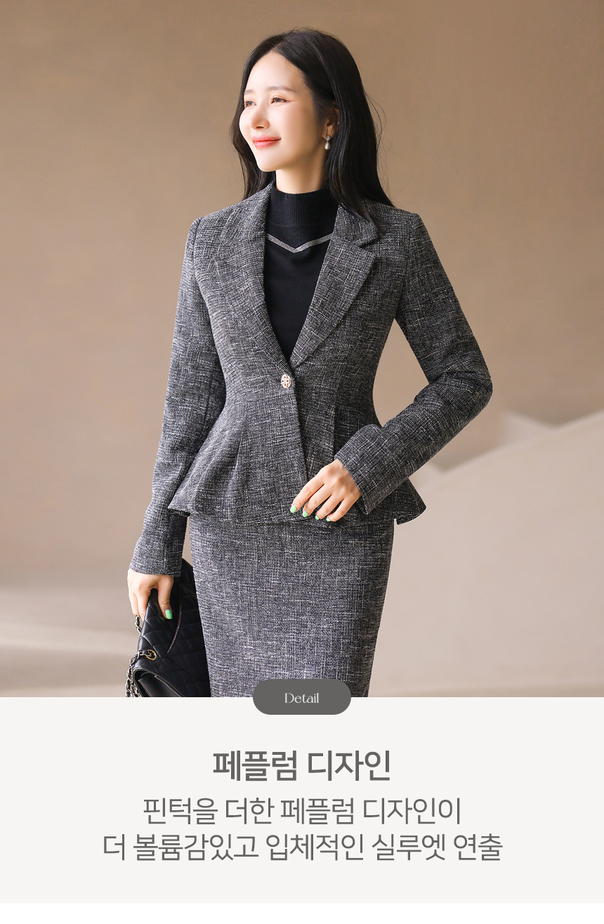밑단이 셔링지는 페플럼 디자인으로 사랑스럽고 우아한 페미닌 무드를 자아내는