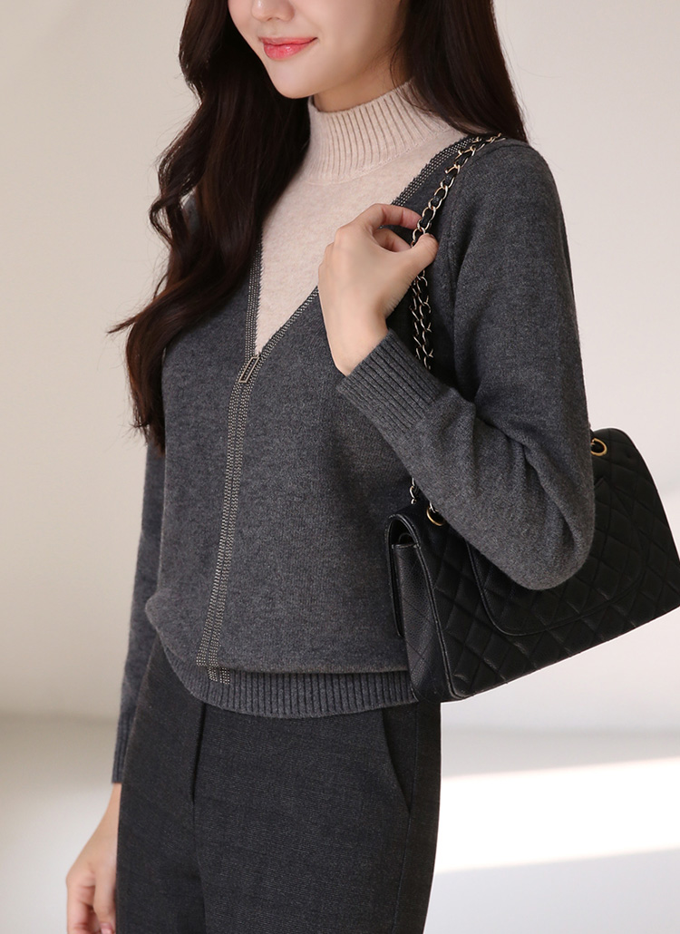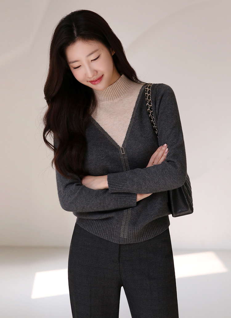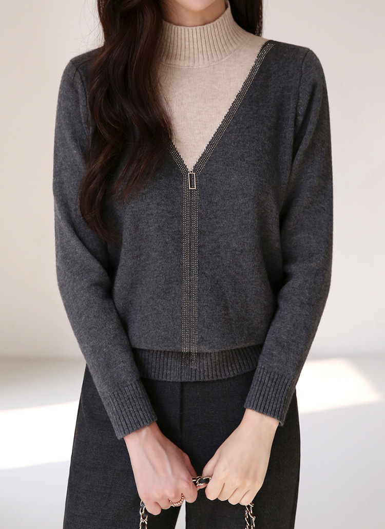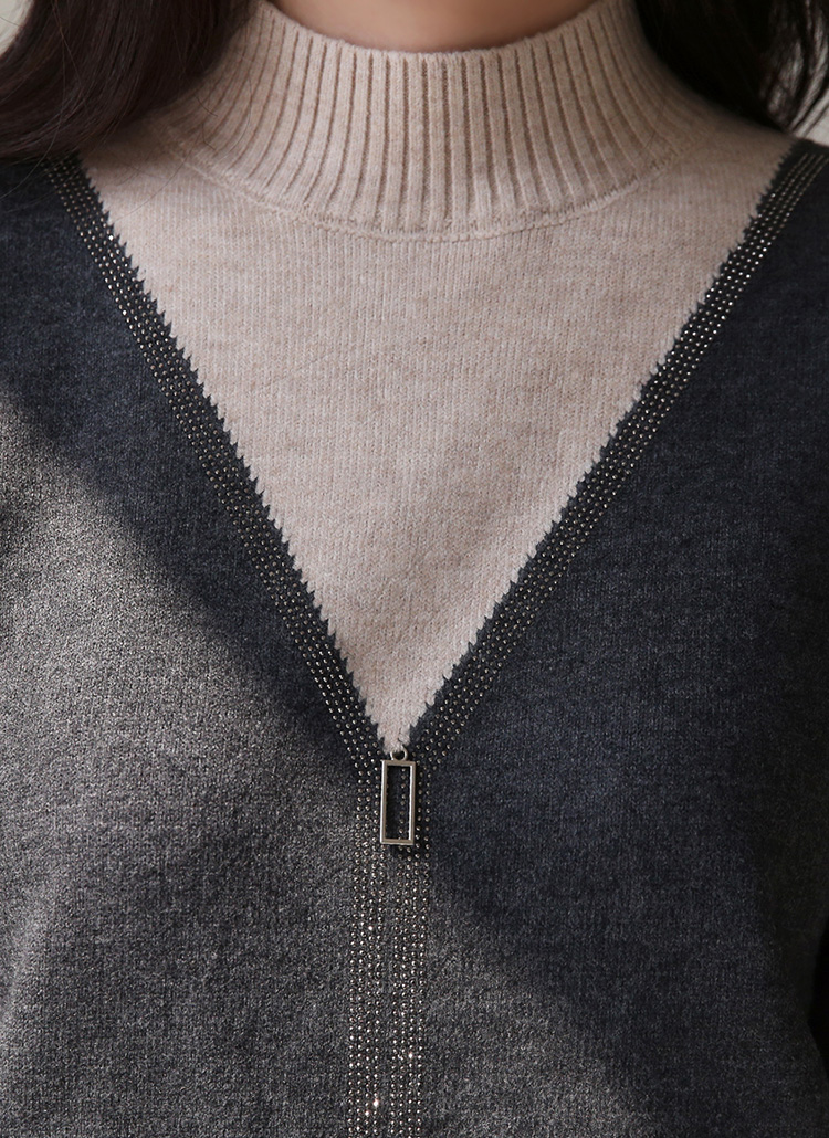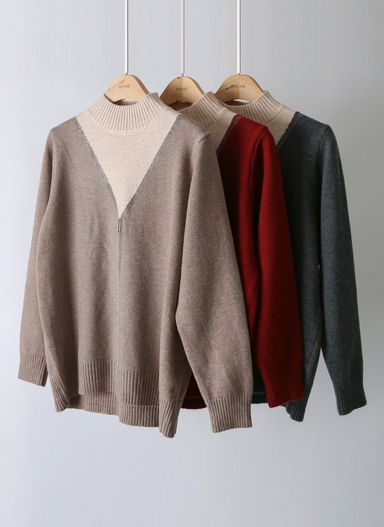 レイヤード風ラインストーン付きハイネックバイカラーニットプルオーバー nt42736