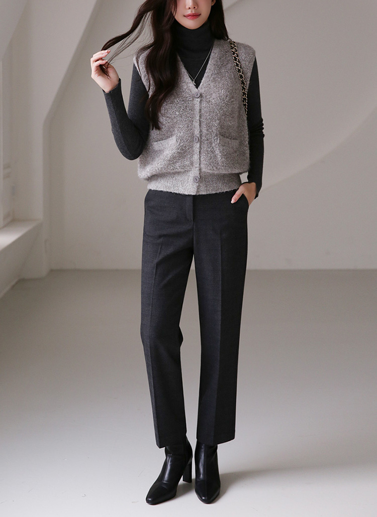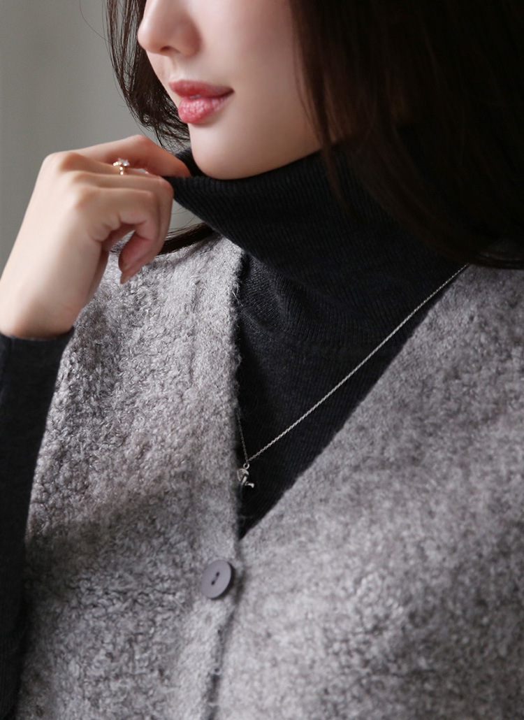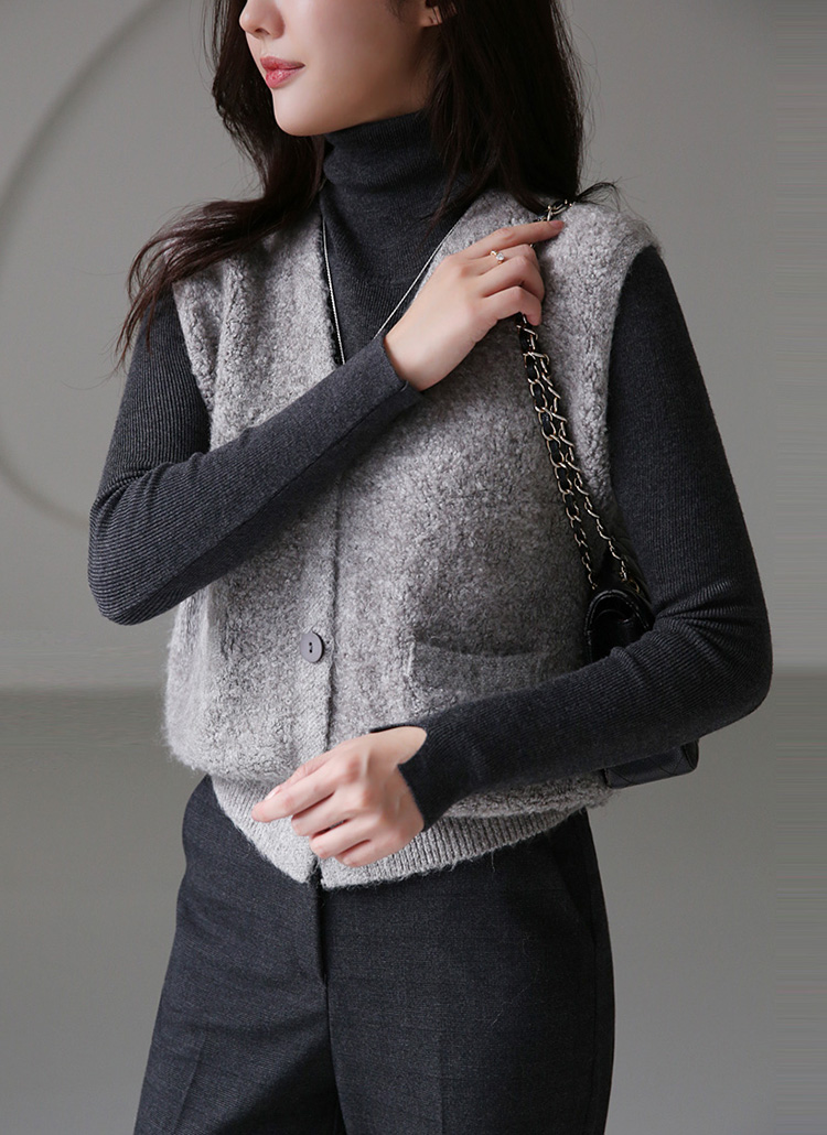 도톰한 부클 소재의 베스트와 슬림핏 폴라 니트가 만나