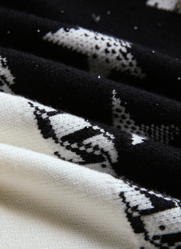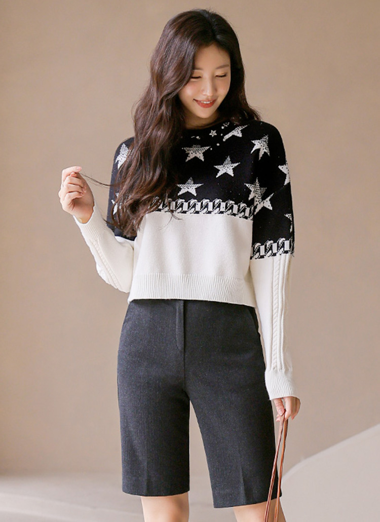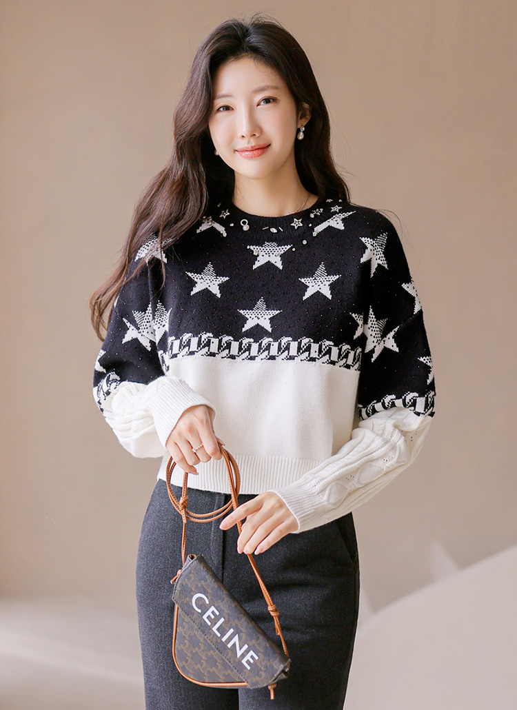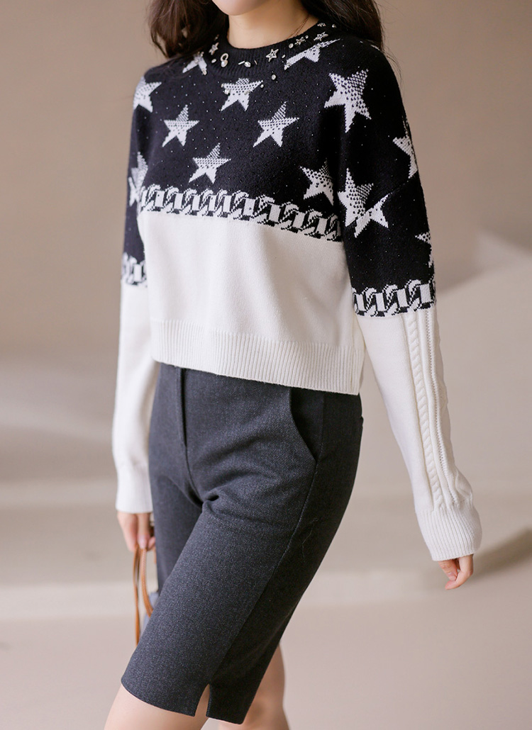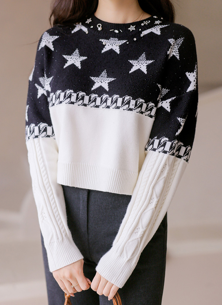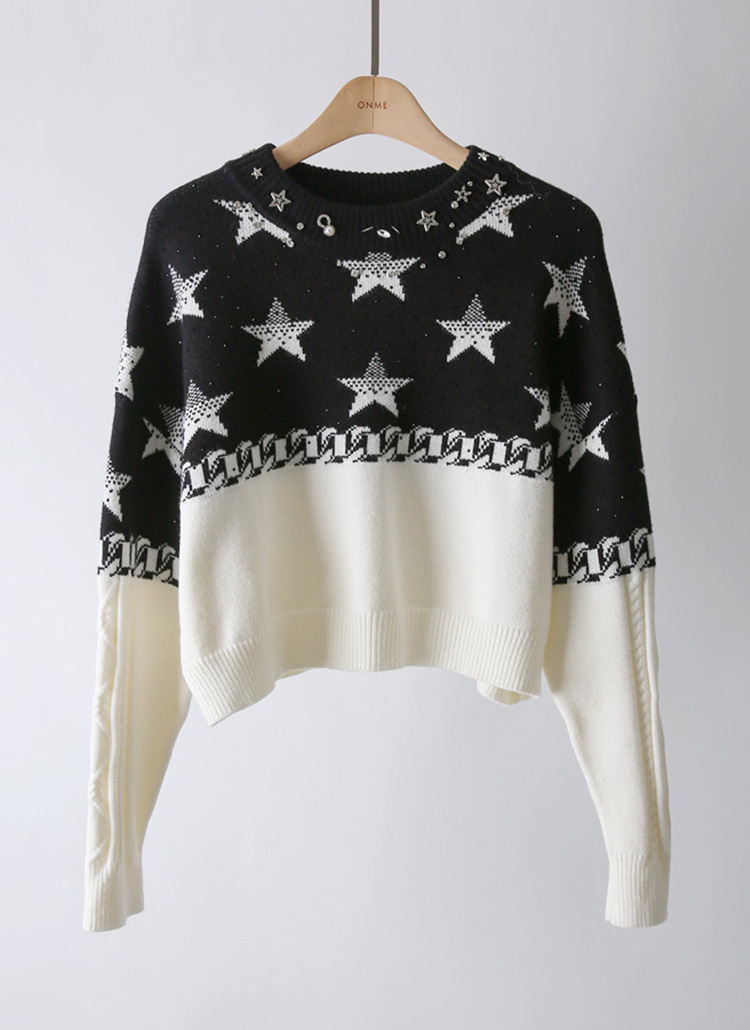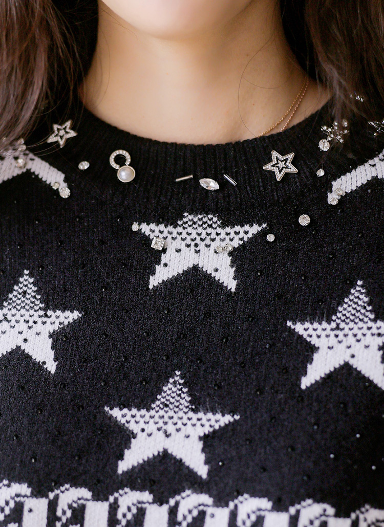 별 패턴 배색에 핫픽스와 스터드 장식으로 스타일리시한 포인트를 준 니트에요 :)