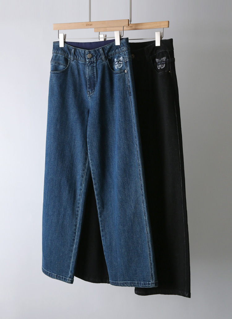 ウエストゴム バタフライ刺繍 ワイドデニムパンツ pt42817
