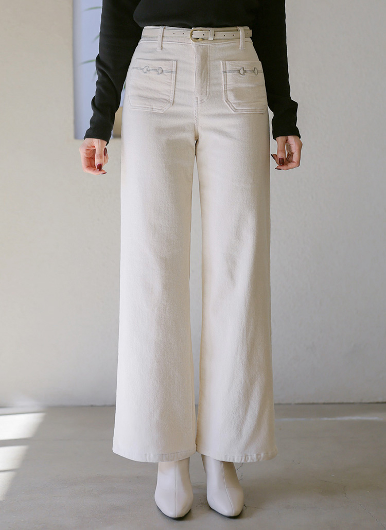 포켓 자수로 세련된 포인트를 준 세미와이드 팬츠에요 :)