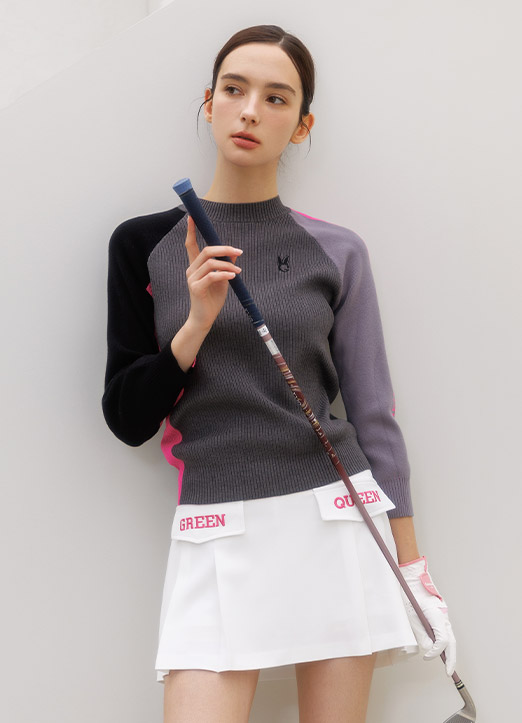 [QoG] 7分袖ピンク配色モックネックリブニット nt42877
