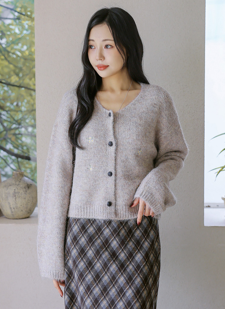 가디건의 세미크롭 디자인이 트렌디한 무드를 연출해주며