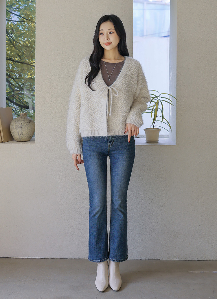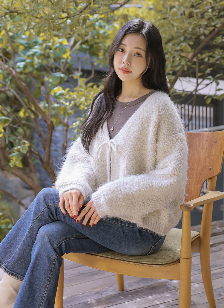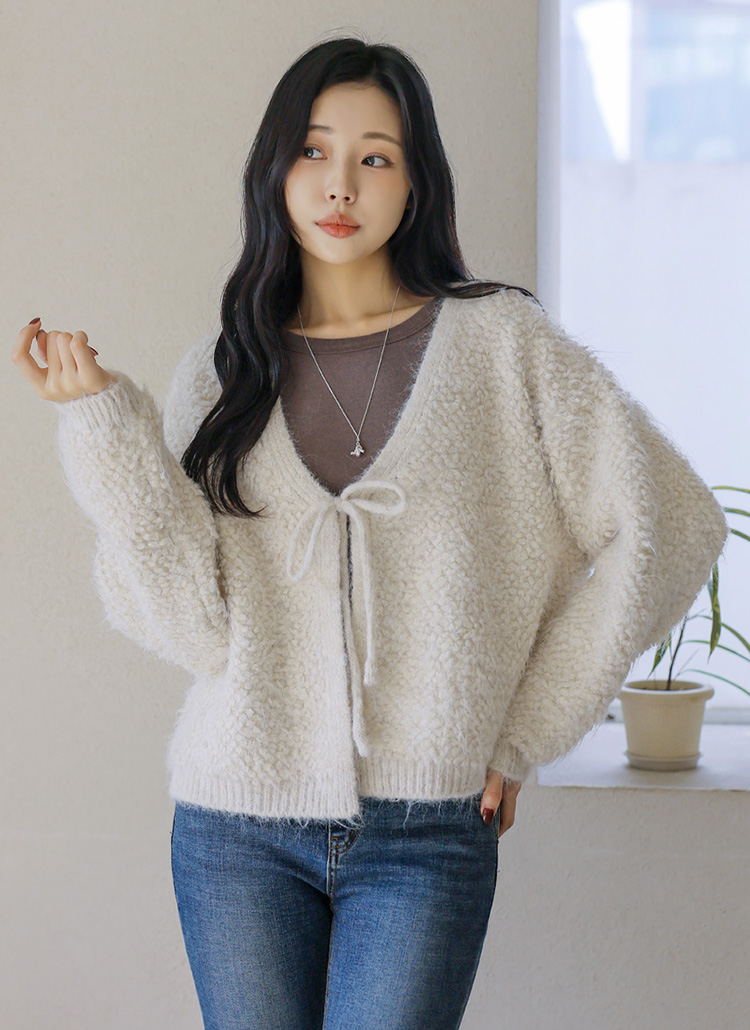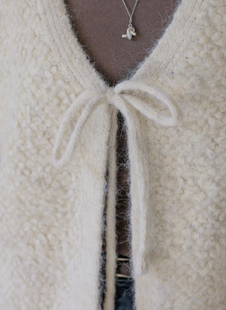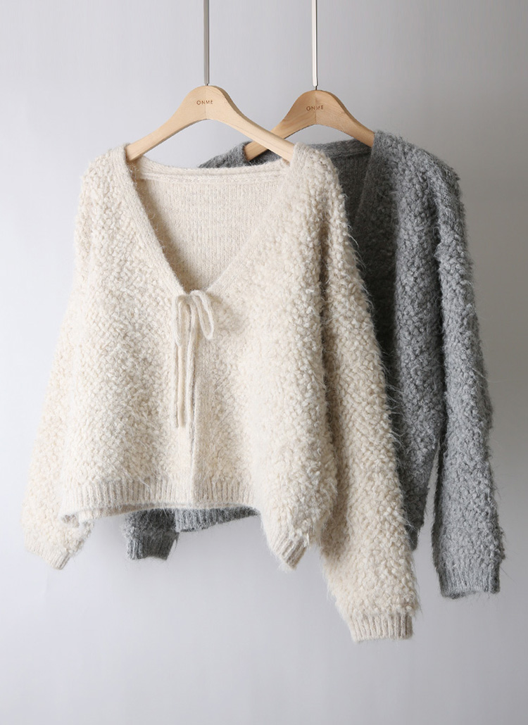 [THE ONME] フロントリボン ヘアリーボアニットカーディガン cd42949