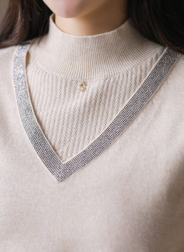 レイヤード風 ペンダント&ラインストーン付きハイネックニットプルオーバー nt43069
