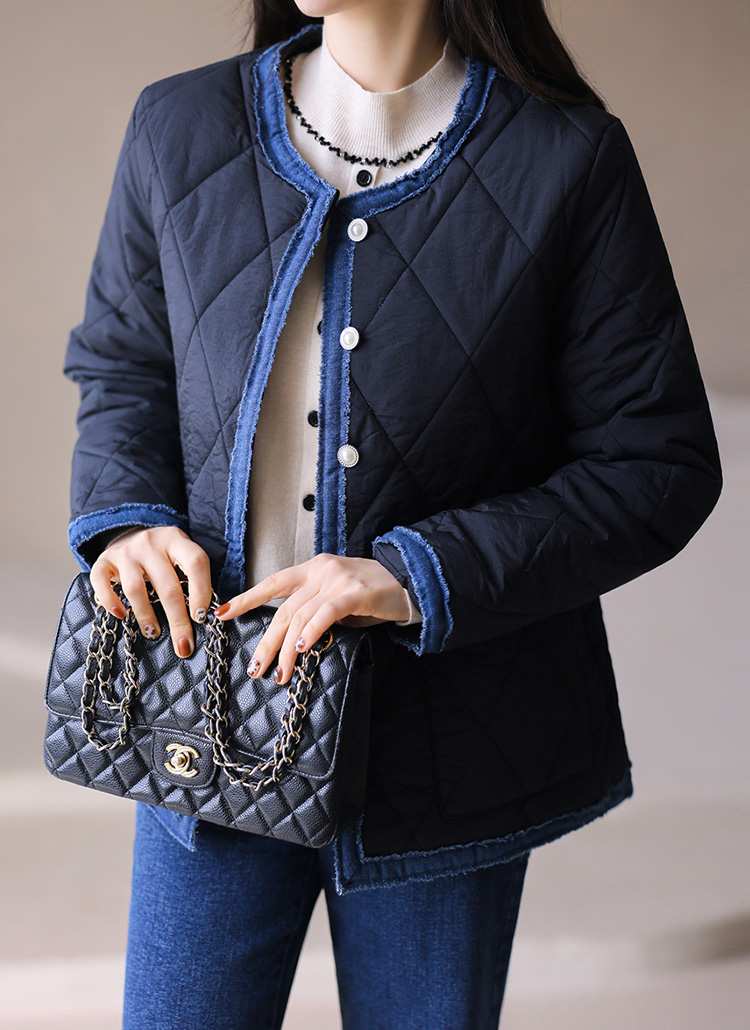 감각적인 데님 배색 디테일로 세련된 무드를 선사하는 퀄팅 패딩 점퍼에요