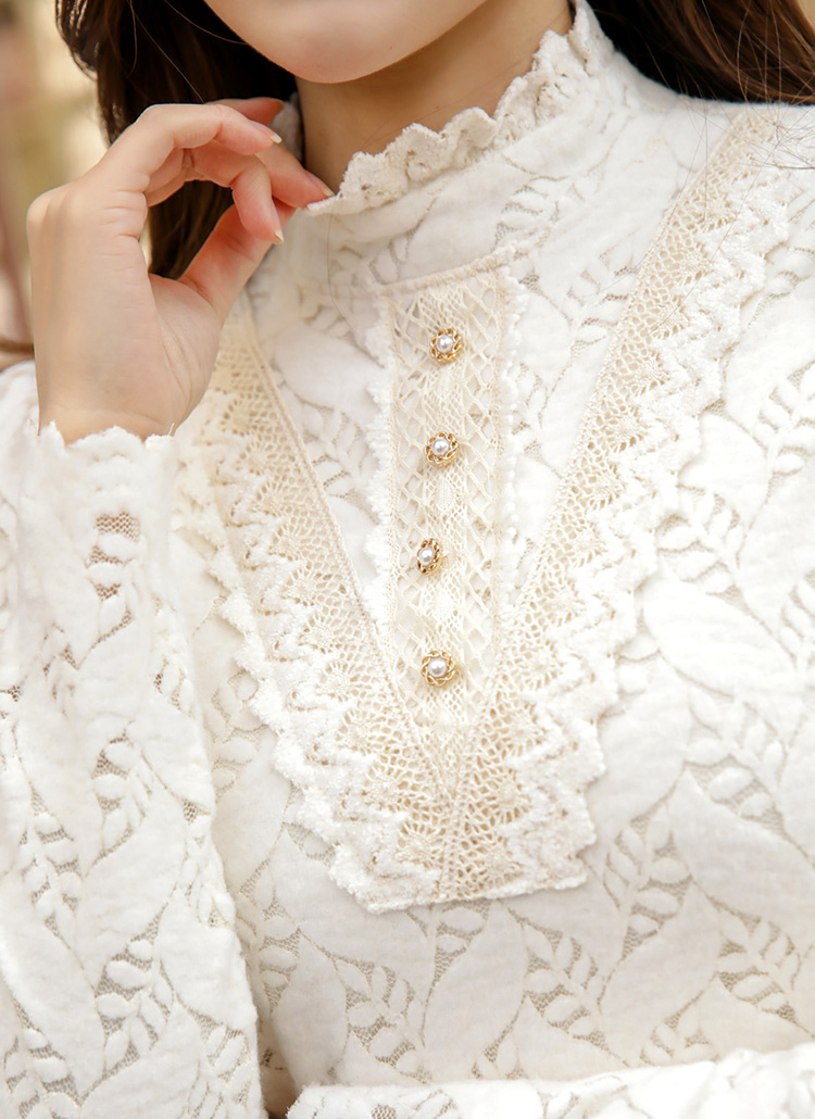 アウターのインナーでも単品でも使える、万能ハイネックレースブラウス。繊細でロマンチックなレースにフロントのパールボタンがエレガントなアクセントに。ほんのり透け感ある起毛レース生地でさりげなくフェミニンなムードも◎ 優れた伸縮性と肌触りがいい起毛レース素材なので冬にも温かく着心地も抜群!