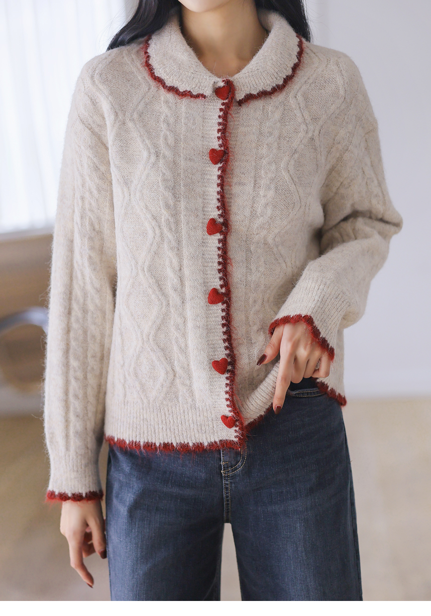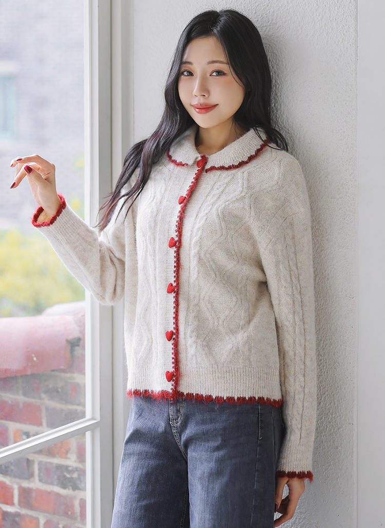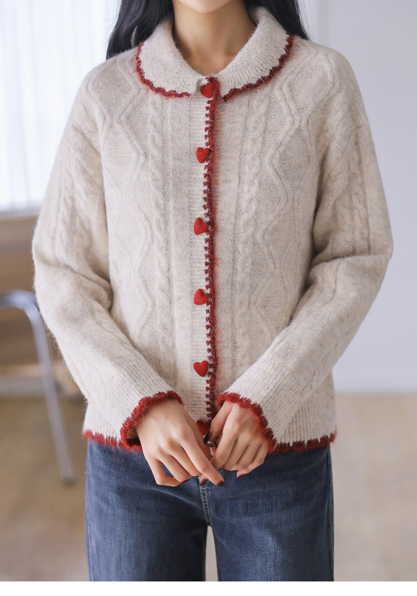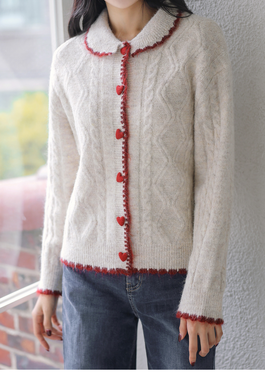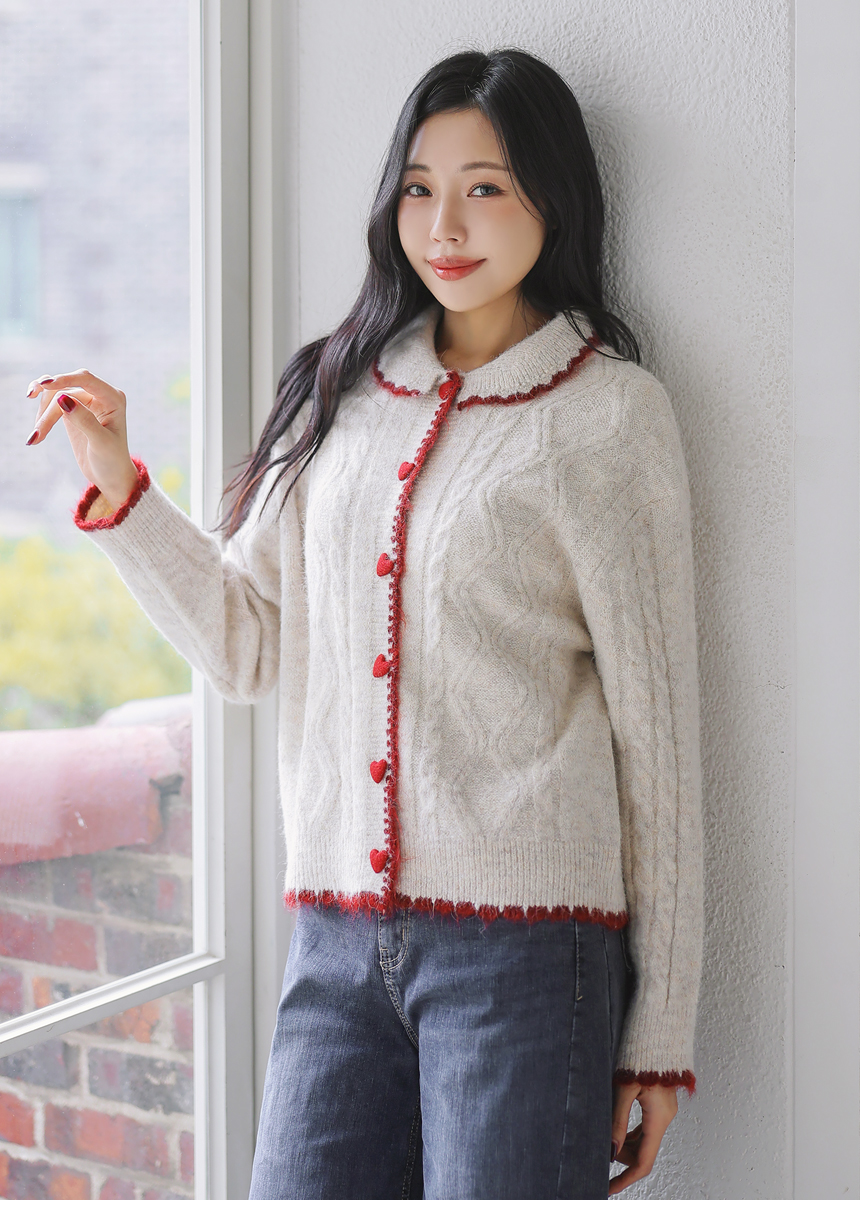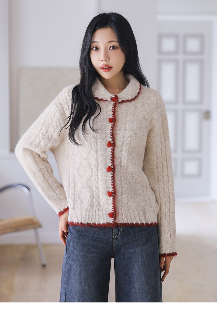 [THE ONME] ハートボタン レッド配色ライン ヘアリーニットカーディガン cd43174