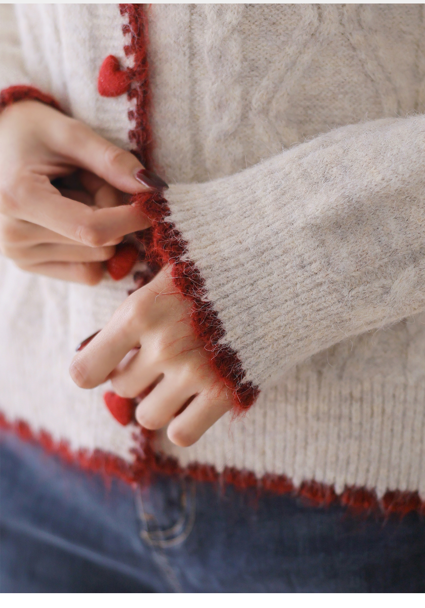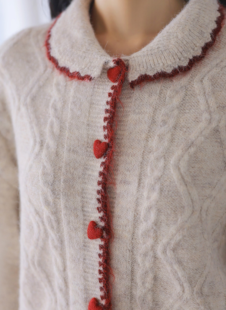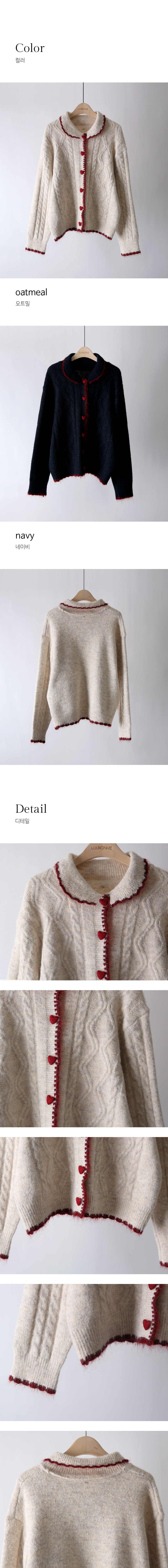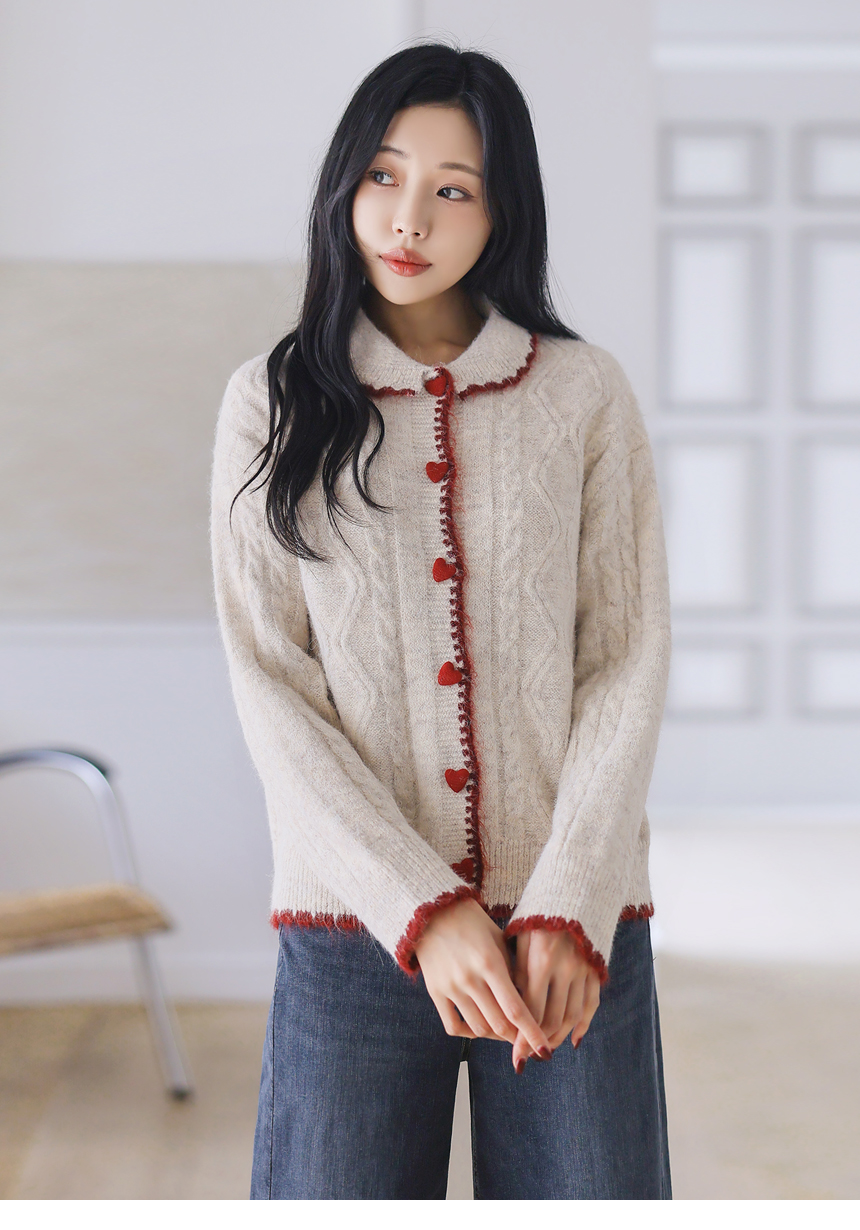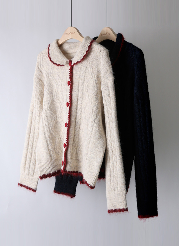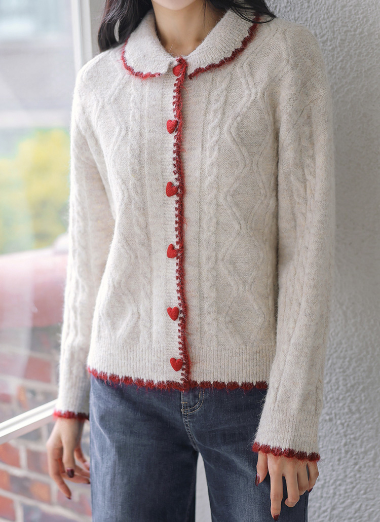 [THE ONME] ハートボタン レッド配色ライン ヘアリーニットカーディガン cd43174