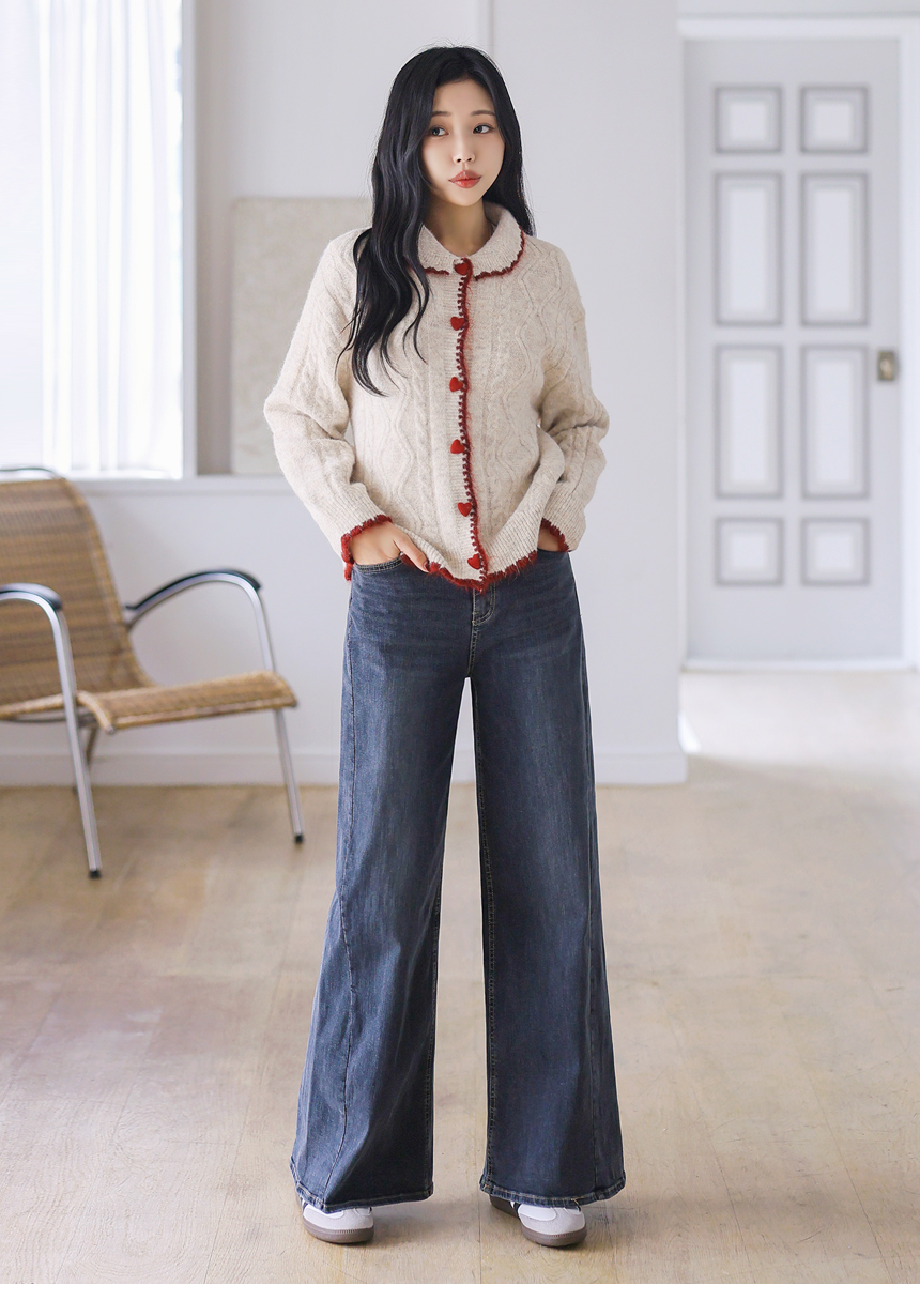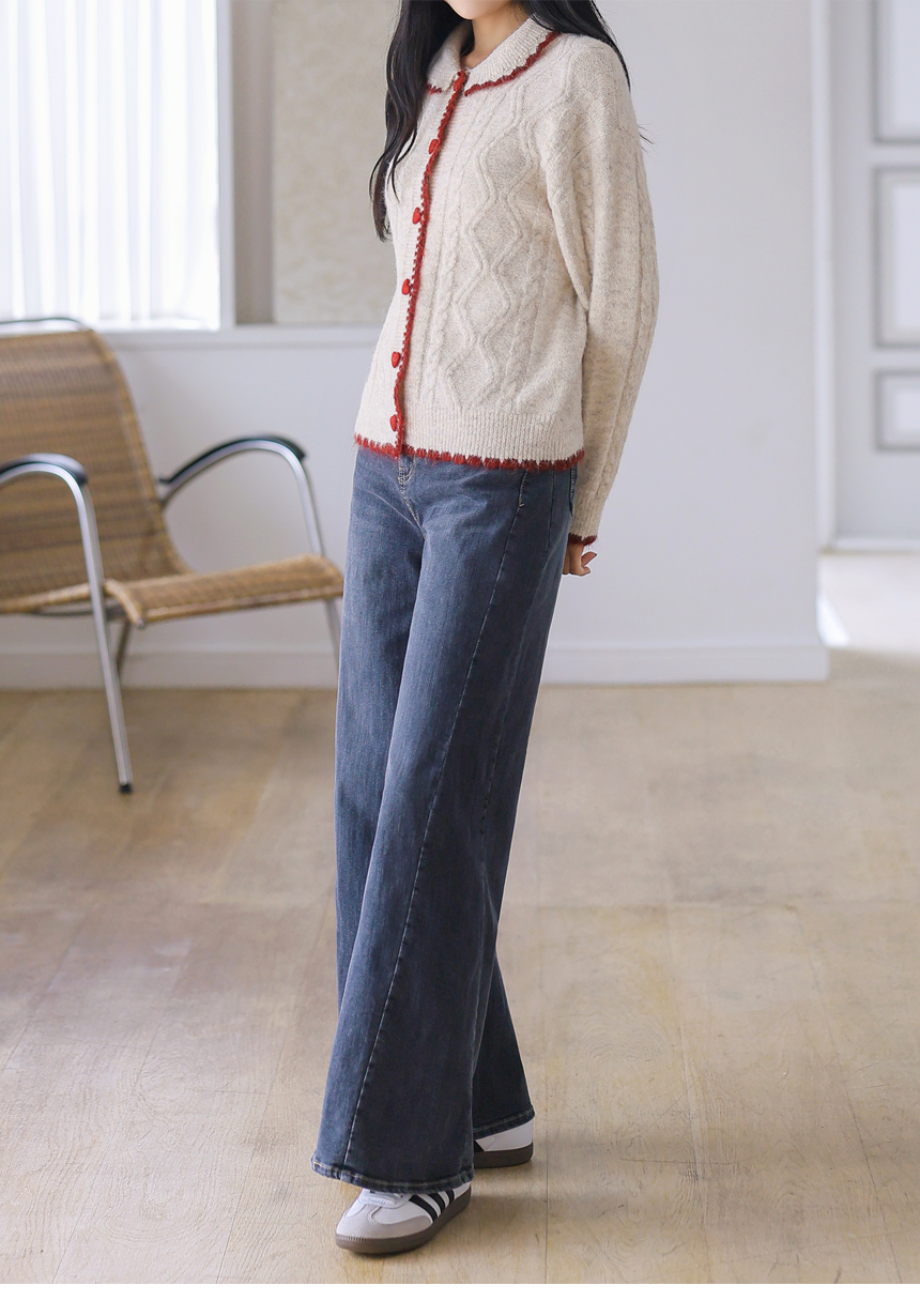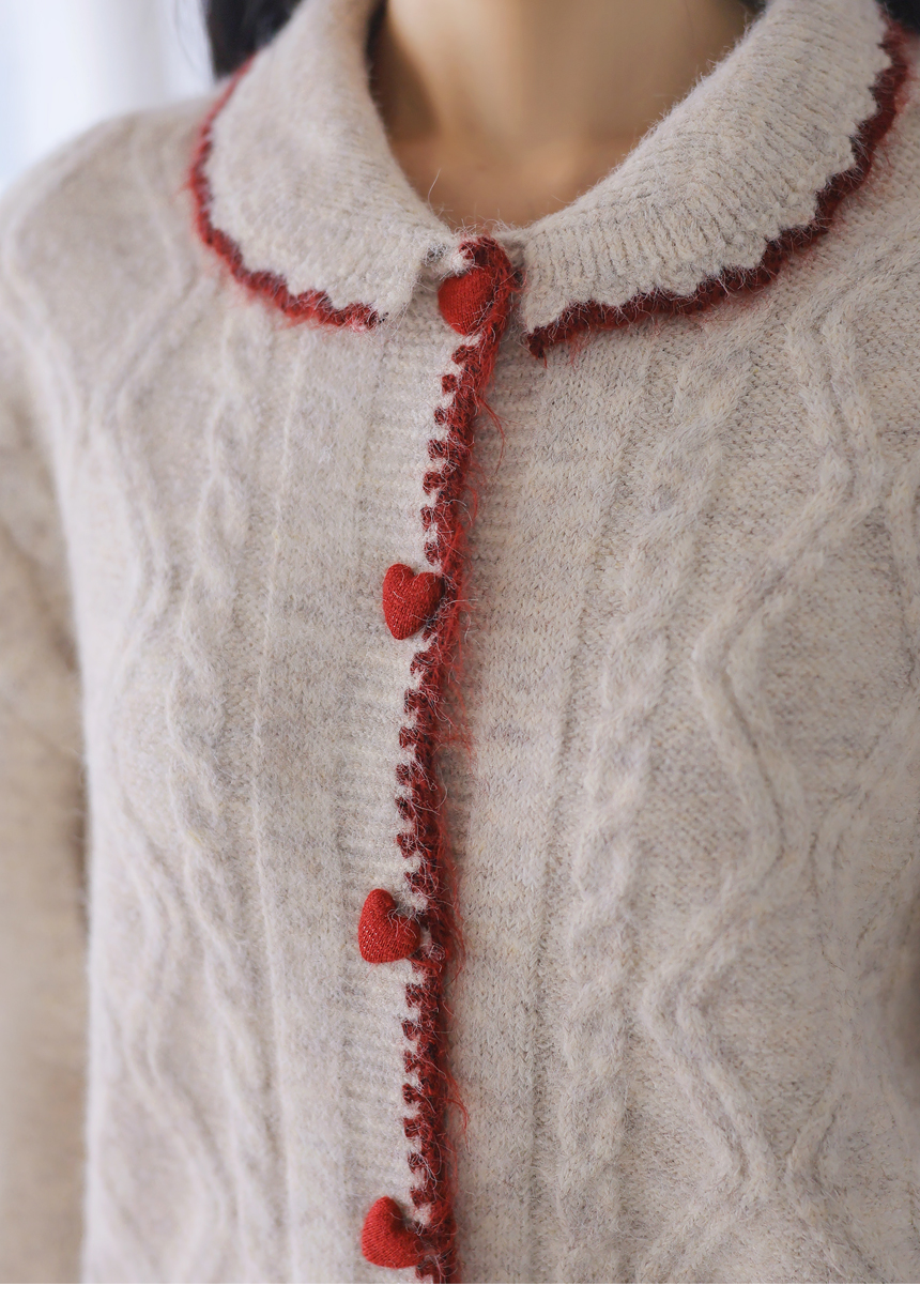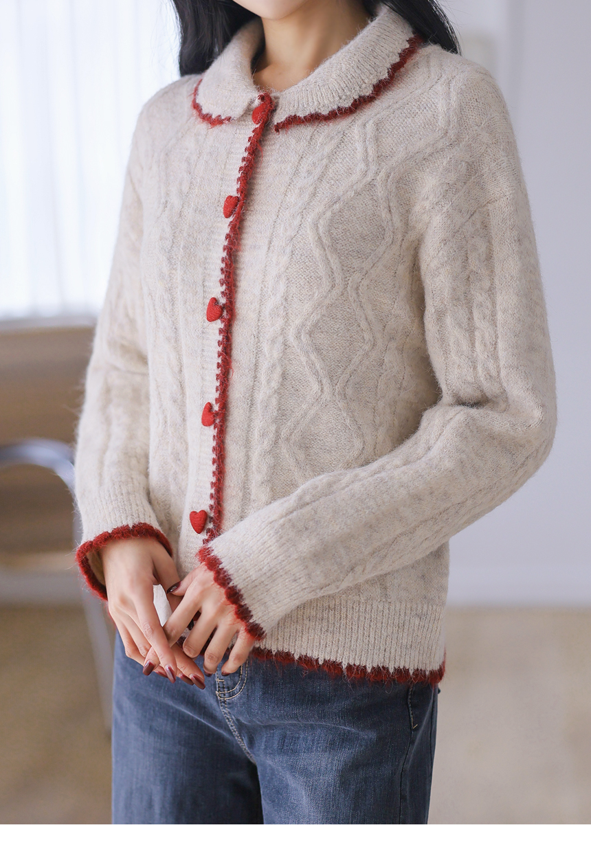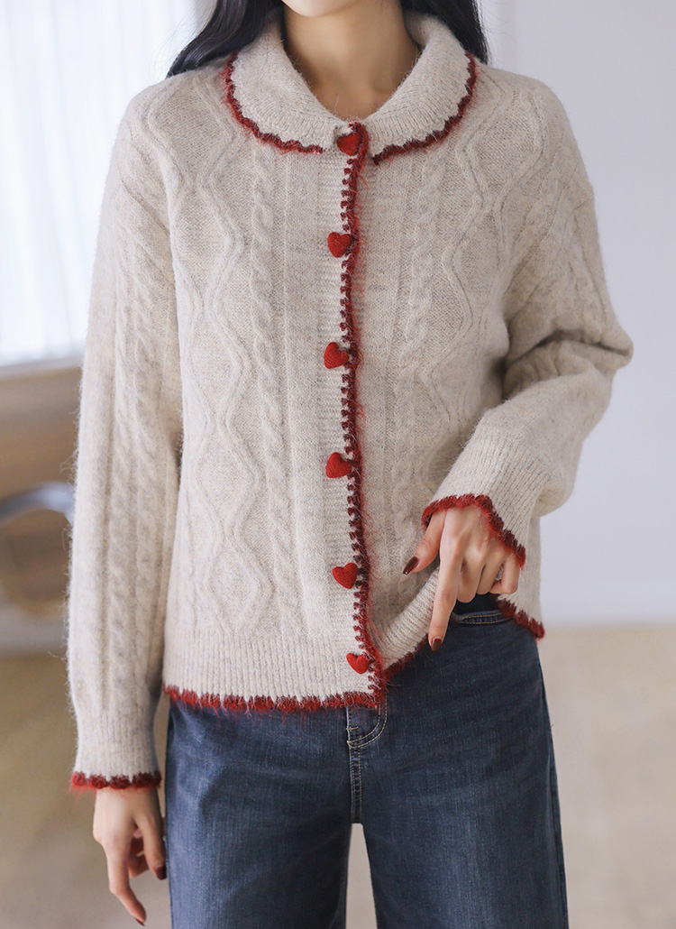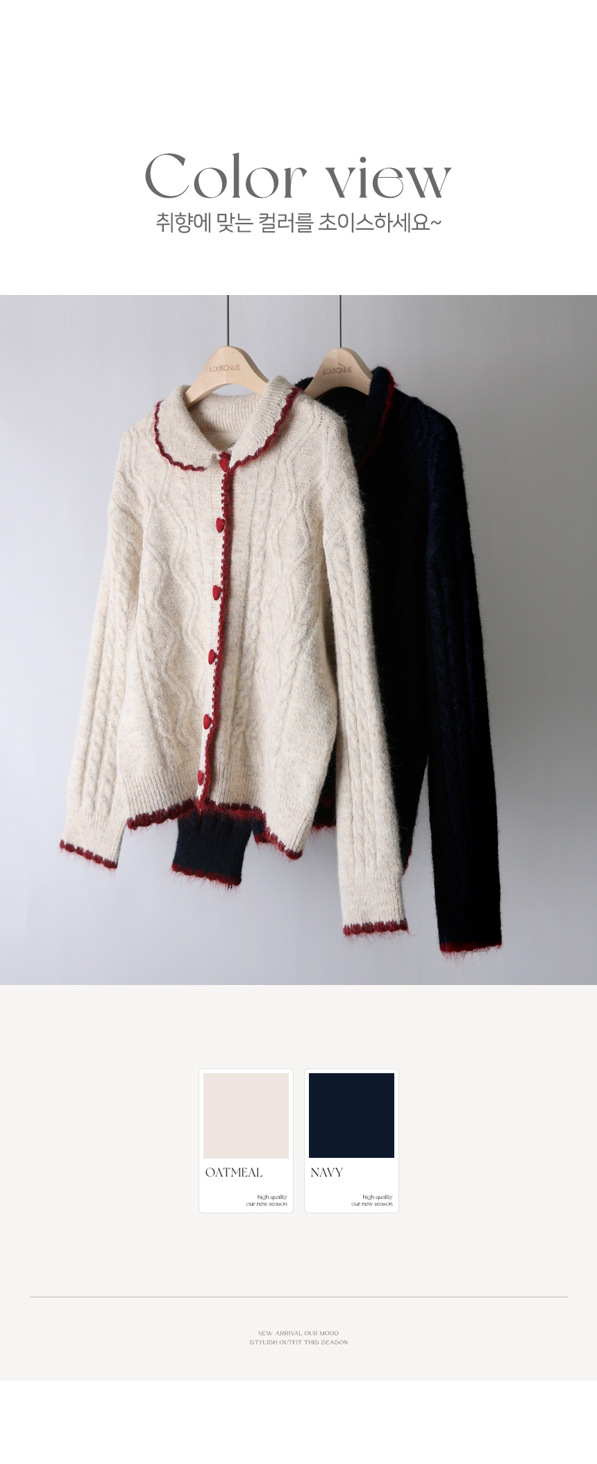 [THE ONME] ハートボタン レッド配色ライン ヘアリーニットカーディガン cd43174