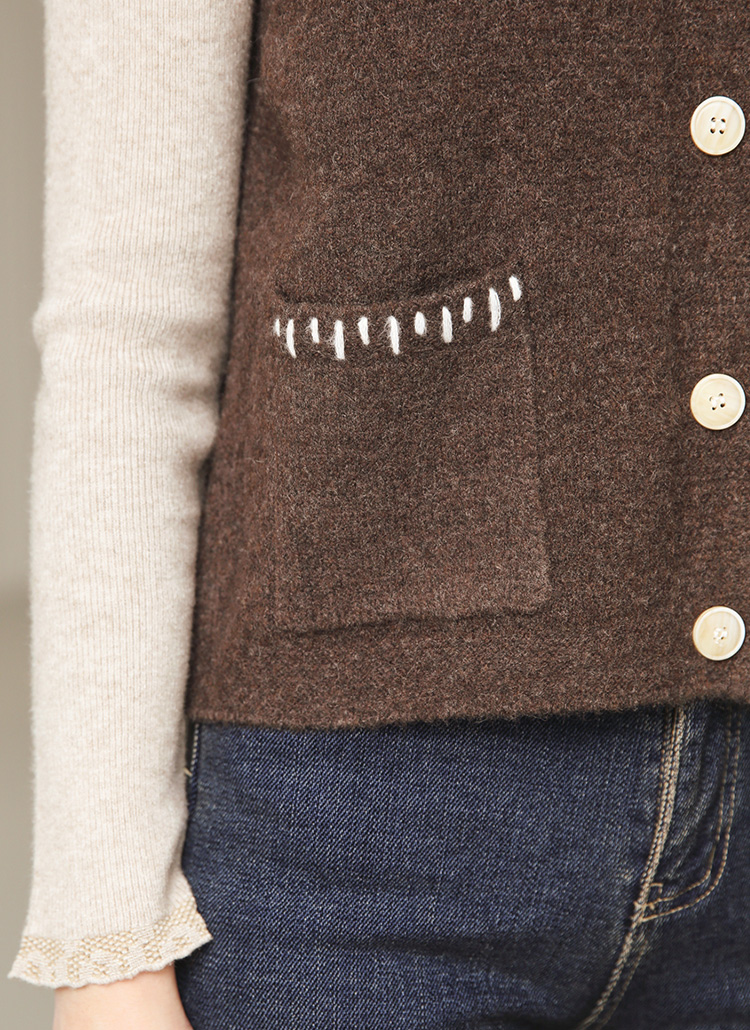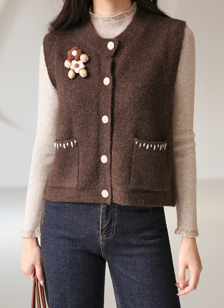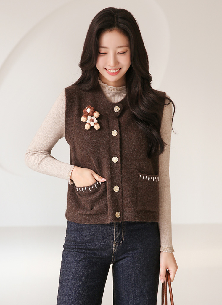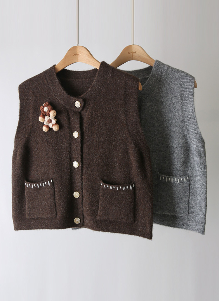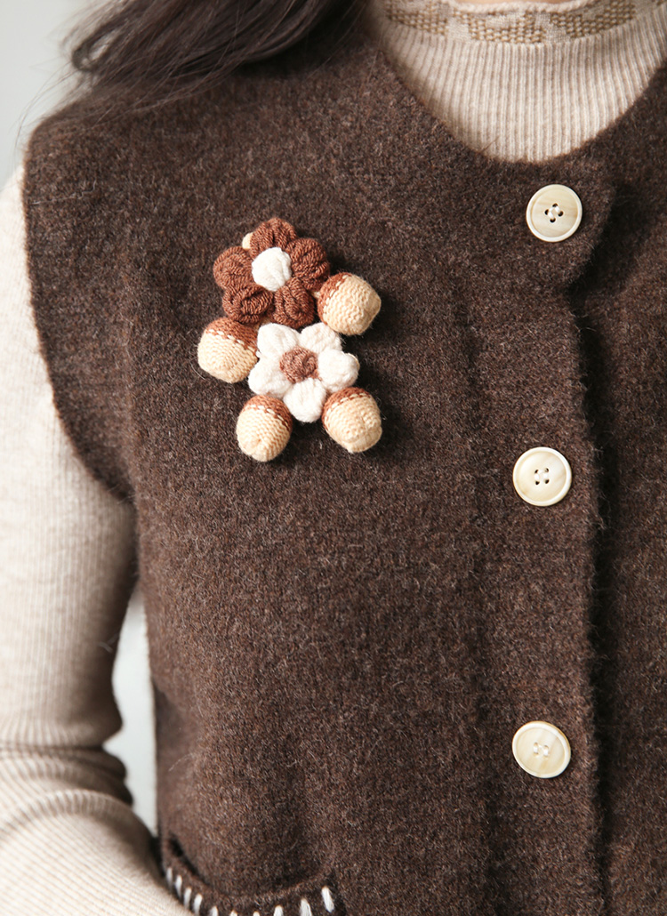 クロシェ編みフラワーブローチ付き ステッチポケットニットベストvt43278