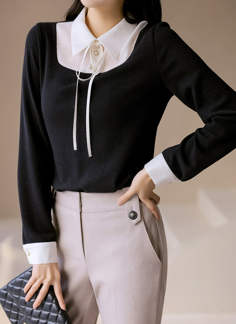 [LouisAngel] 配色リボンタイブラウスドッキング リブプルオーバーts43293
