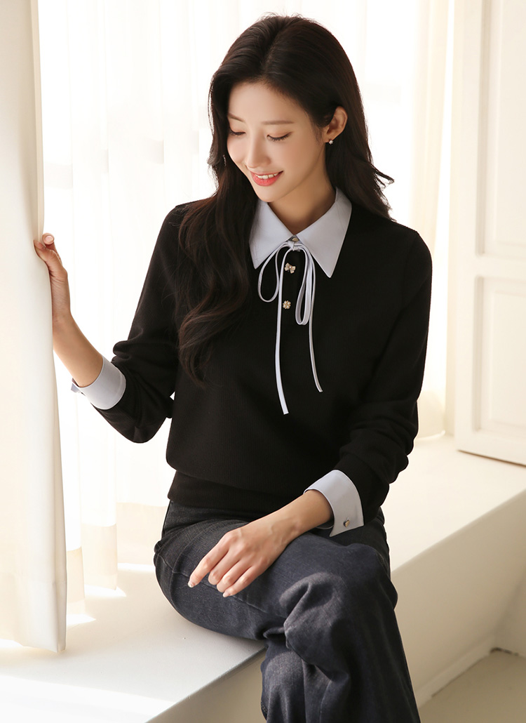 깔끔한 카라 디자인과 배색된 소매 버튼 포인트로